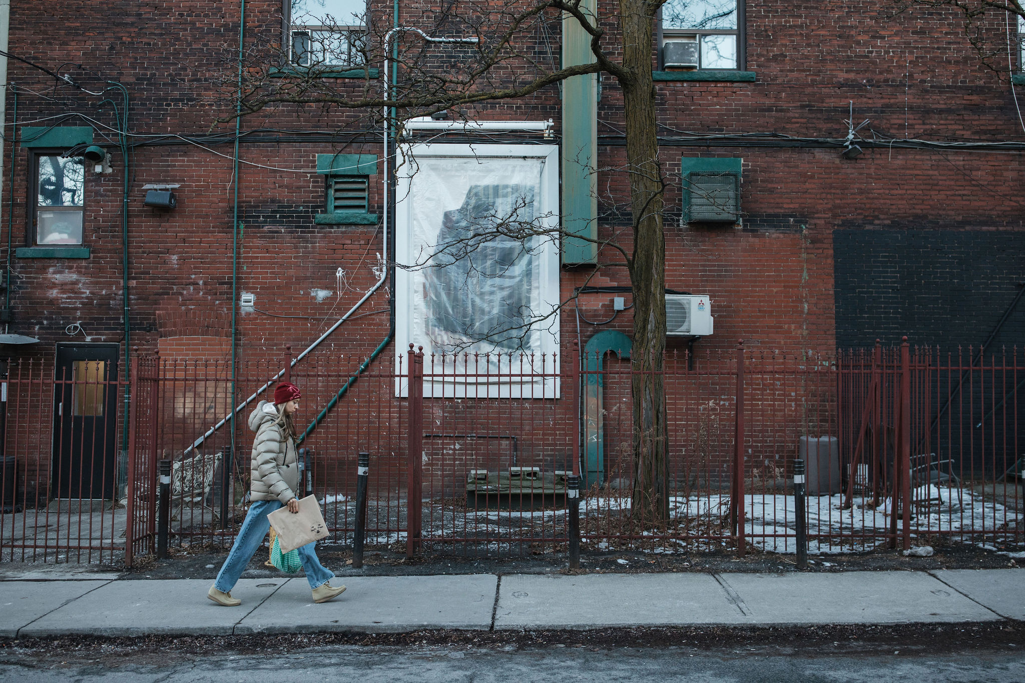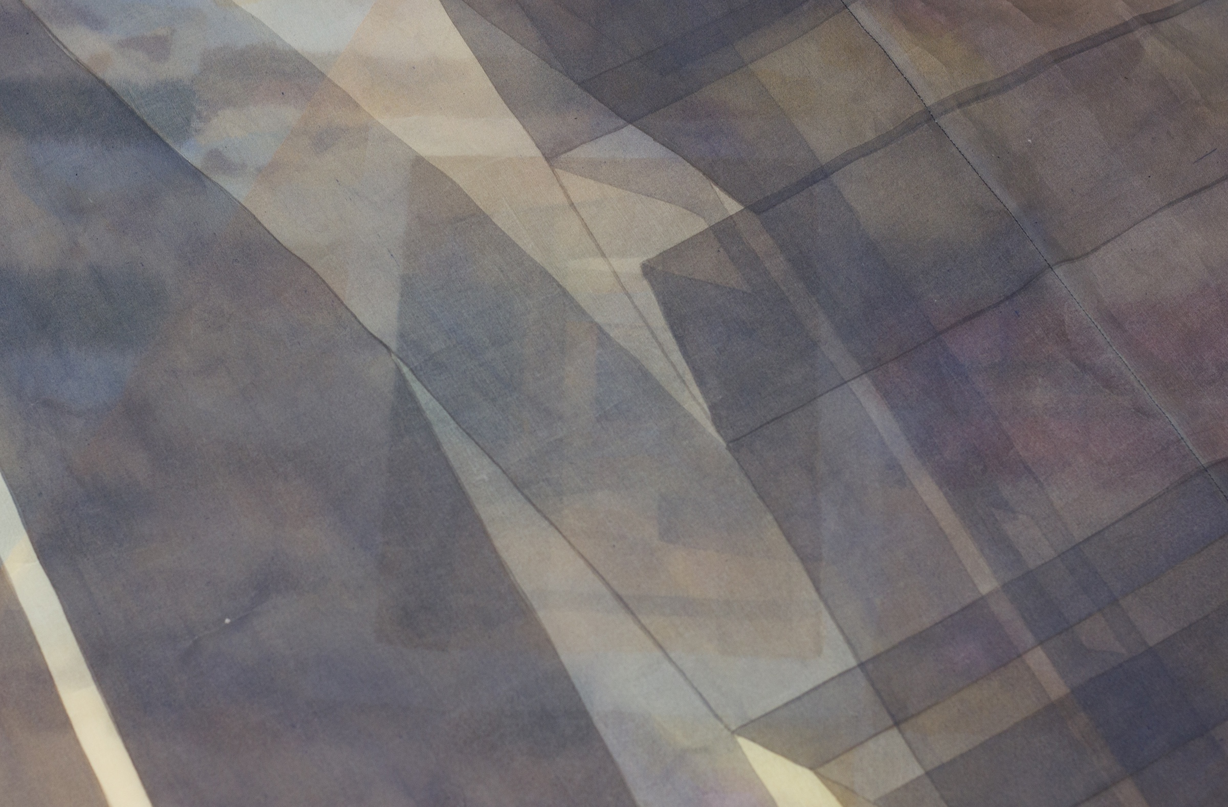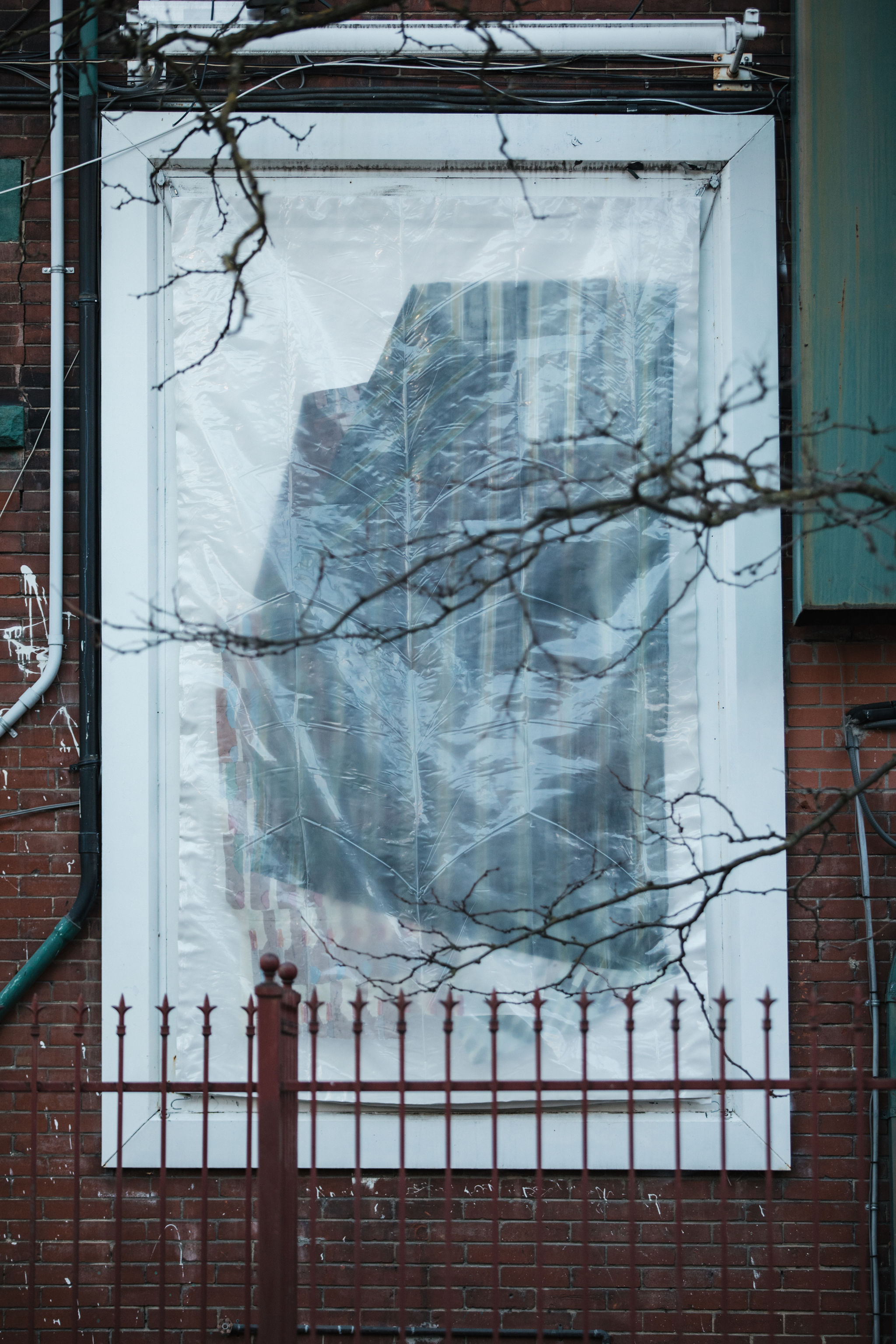 Her intuitive and expertly drafted x-rays of built structures invite a dreamlike navigation of spaces, places, and times that remain inconsumable, just slightly out of reach. To these pictorial volumes, Gonzales often adds dimension by using layers, opacities, creases, and folds as an infinitely variable language for orienting to her subject. At Mercer Union, her paintings engage a new form, introducing materials like vinyl and polyethylene as companion surfaces that hold, protect, obscure, and disrupt the composition. Over the course of one year, Sleeve plays with the billboard site by iterating gestures within a single shell. Collapsed organza, Piña and Jusi silks painted with acrylics appear and accumulate, in a slow reveal of three sculptural banners or perhaps, three distinct moments in a single work always in the process of becoming.