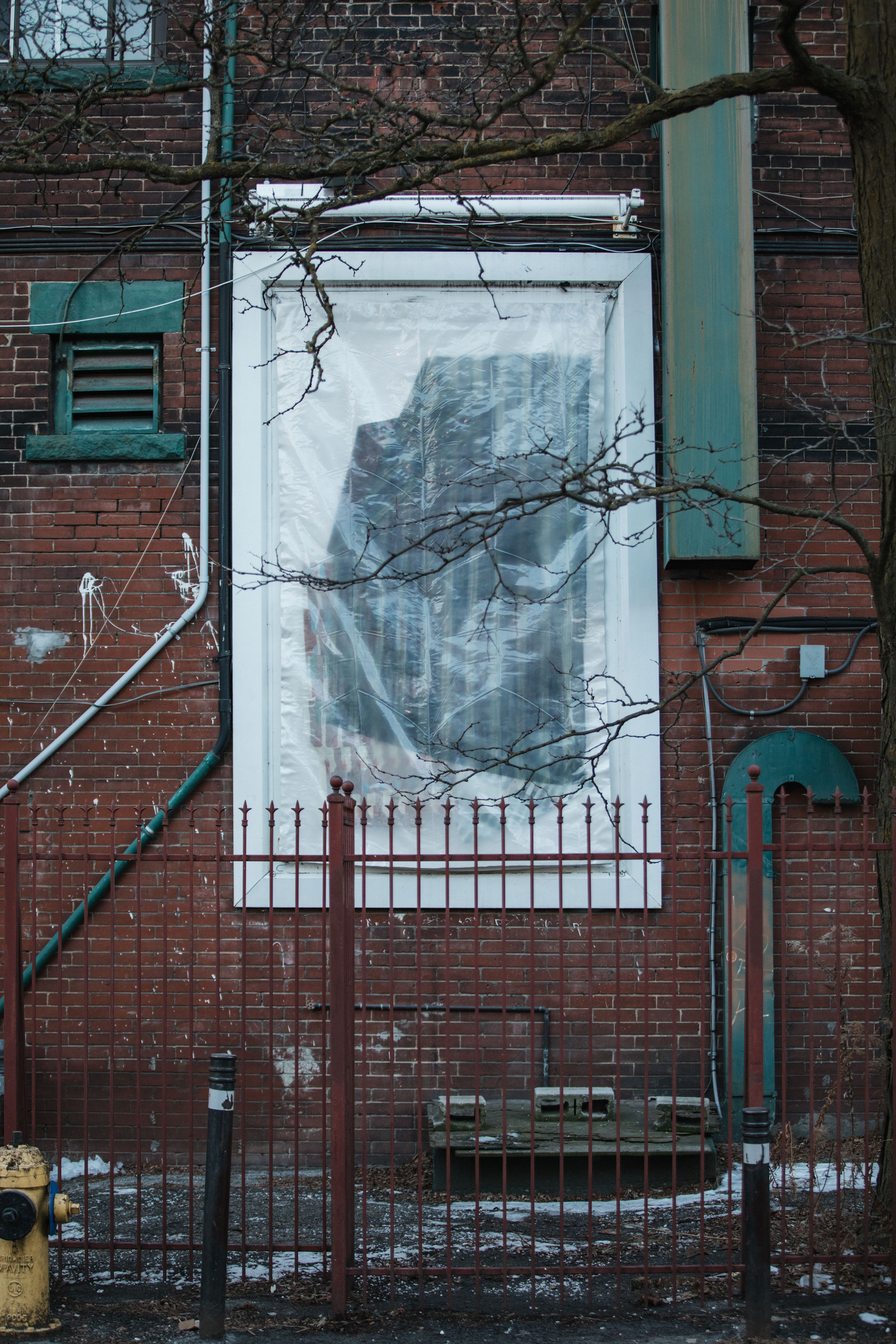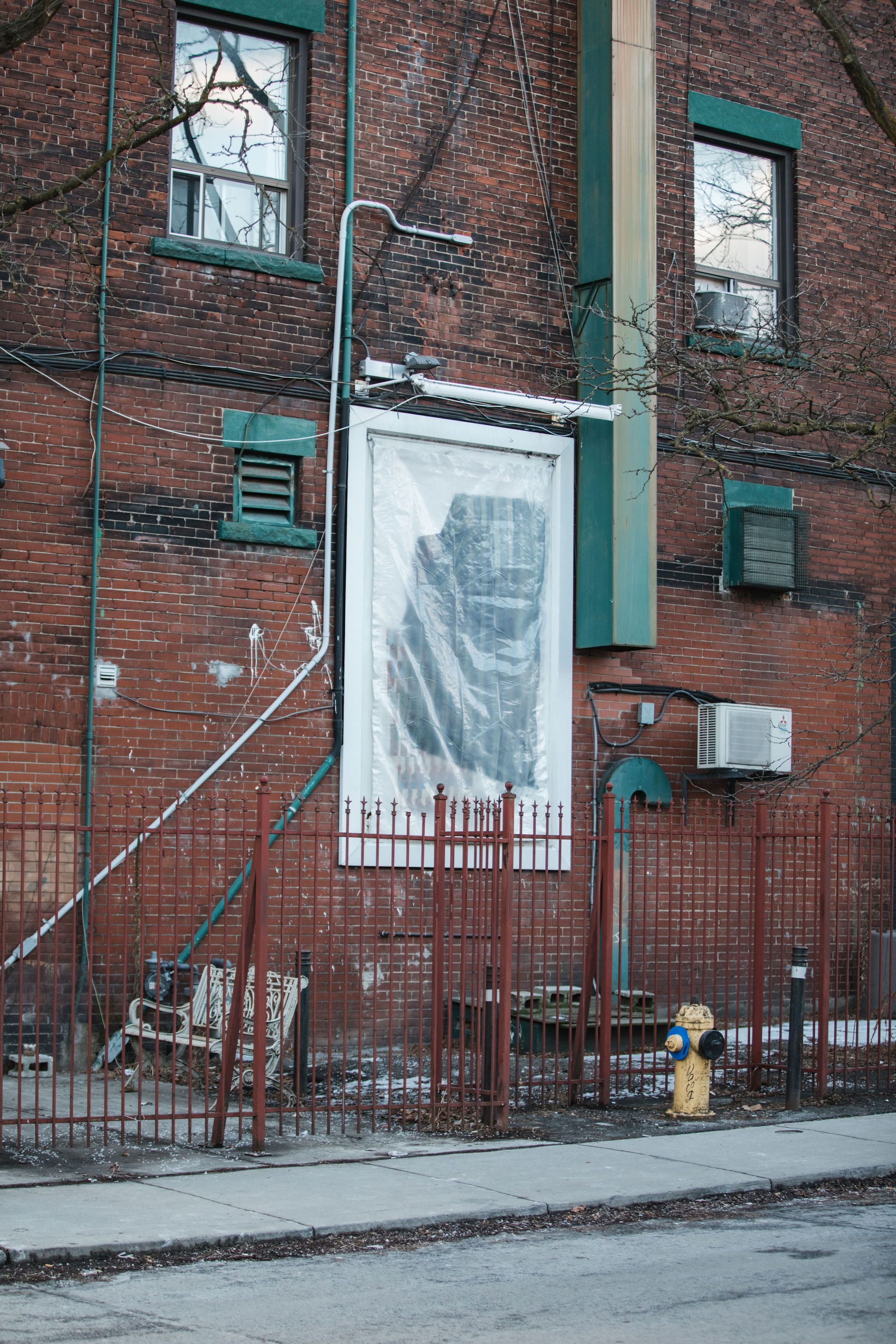 When I walked past your billboard at the beginning of the year the sleeve was billowing in the cold wind and I could barely see through it. The billowing effect created the image of a semi-opaque inflatable pillow. It was such a cold January evening, it seemed fitting with the lack of visibility in winter that I couldn’t see your paintings inside the sleeve. When I saw the work in the fall, it seemed to also match that season with summer’s end starting to reveal brown branches. It was such a bright day that day that the various shades of brown and green from the tree next to Sleeve and the building’s brick wall that it rests against, with its various shades of reddish-brown, amplified and simultaneously disguised your work.