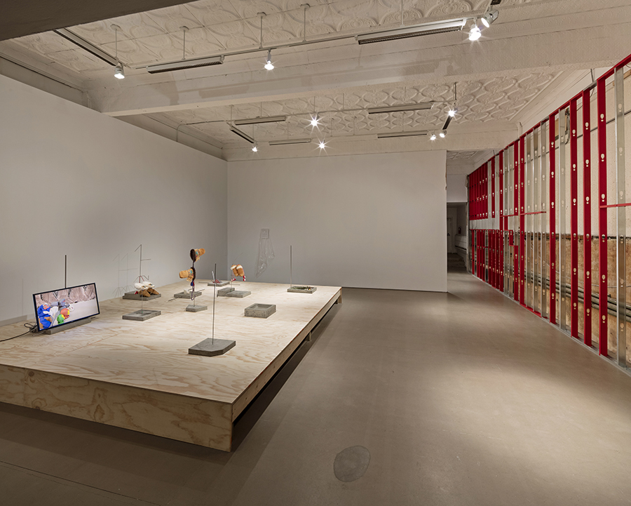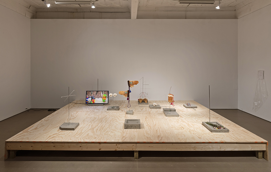 The title of this exhibition From Our Hands refers to an exhibition which toured Ontario between 1983 and 1985 presenting Indigenous craft, and including the work of Ethel Linklater, Duane’s grandmother, which are re-presented within the galleries and displayed on new support structures. That this loan was negotiated by Mercer Union through the Thunder Bay Art Gallery mobilizes present day structural relations of cultural heritage while highlighting traces of genealogy and questions of legacy. This intergenerational relationship is extended in the presentation of a recent claymation film by Duane’s twelve year old son, Tobias Linklater.