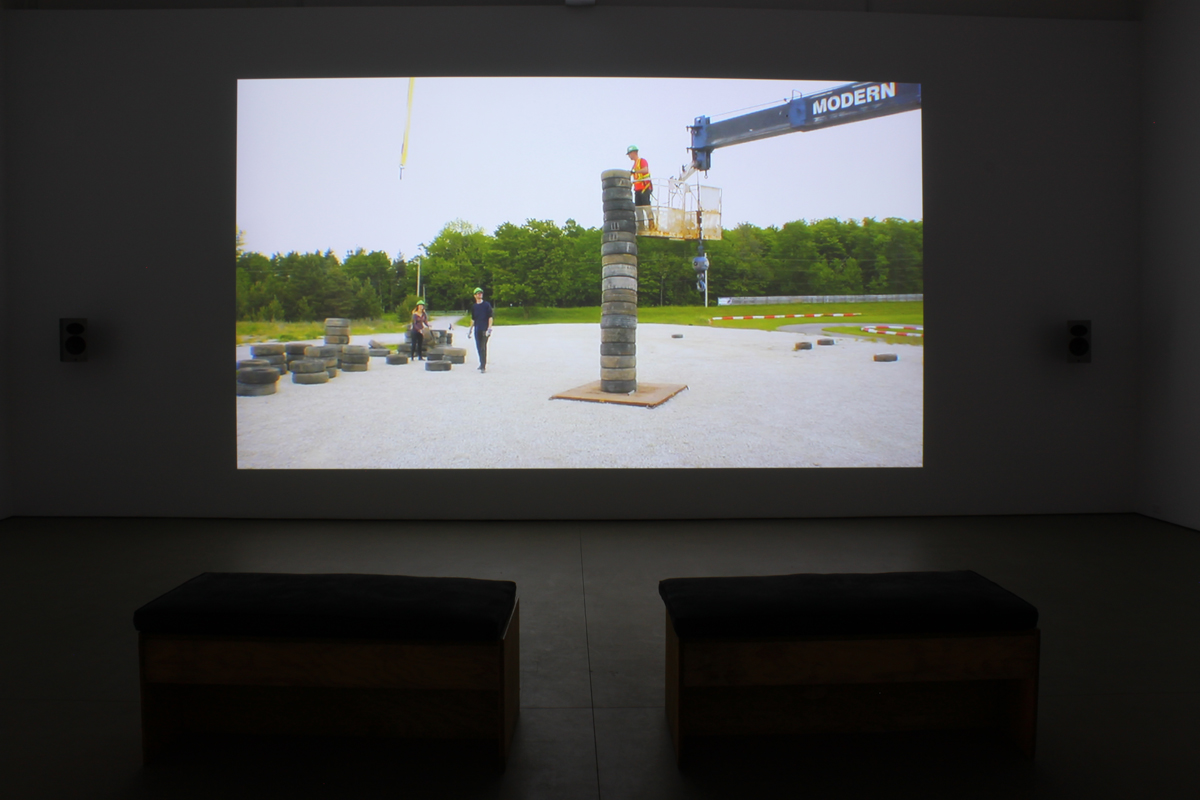 In The Seduction of Galileo Galilei Mir ignites an intellectual affair with the scientist, four centuries after the fact. Her proposed rendezvous takes place in a gravel lot adjacent to a racetrack, where she performs a gravitational feat of her own—the stacking of a single column of automotive tires that rise precariously to the heavens. Though the column may reach the height of the famed Tower of Pisa, Mir is more concerned with space of play that opens when failure is a permissible outcome. This impetus represents an inversion of the normal parameters and aims of construction. Though Mir relies on the highly skilled labour of the crane operator—his theoretical knowledge of physics combined with in-the-field experience of hoisting objects into space—her thrill is the tipping point between the expected results and the limits of control. For example, wind, the shape of the tires, the energy of the crew to gather the tires, all these determine at what point the construction will spill over. The impulse to stack is a primordial one—visible in the play of children handling building blocks, but also the most elaborate ancient architectural wonders.