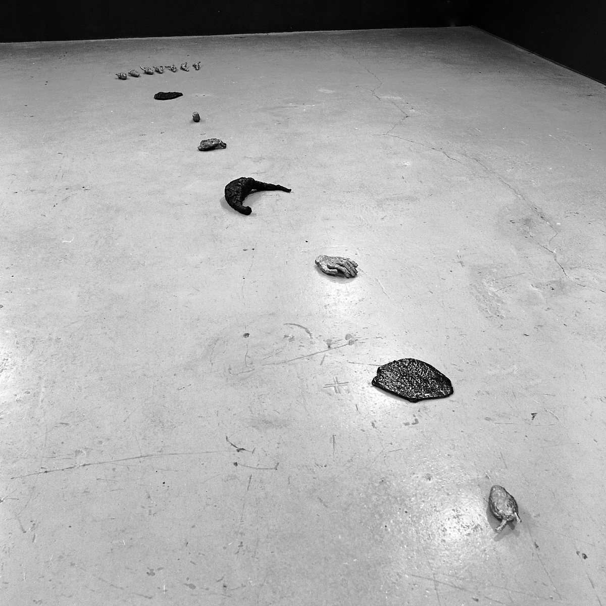 Even considering that art galleries are seldom frequented by lummoxes, most of the sculptures in this exhibition are so petite and vulnerable someone might inadvertently stomp on them, meek and squiggly upon the floor. At the entranceway are three little lumpy lead feet. Elsewhere, a trail of thirteen anatomical simulacra struggles toward a doorway: seven hardened hearts, a squarish slice of red metal spleen, a silvery bone-like thing, two small stiffened hands, a puny black rubber stomach and a flabby slice of rubber liver. On one of the walls the bronze sculptures sit side by side, semblances of human ears, except that instead of ear canals they have gnarled, spindly protuberances. The exhibition includes in addition two photographic works and the fact that the interior walls of the main, specially-built display area are a very serious, mineral blue. The construction of this area did not appear to imply that architectural elements were contributing anything to the interpretation of these sculptures; rather, the redesign of the gallery space seemed simply to allow a direct attention to the autonomous, tangible integrity of the separate sculptural projects. The evolution of the meaning of these works, it seems, begins in their tangible qualities; the paradox of central value to these sculptures is that an intimation of something immaterial could be accessible to the sense of touch. It is as if the ephemeral could be felt with a finger if only tactile sensitivity were intensified to an extreme, or that metaphysical can be palpated unseen in the physical, the inert quickened through contact with the hand. The cool gummy surface of the liver object, when it is prodded or picked up, for example, shudders in one's grasp, though not with slimey hysterics. What has happened is that in poking at such a pulpous object, one's own subjective shiver ends up becoming an objective feature of the things being handled. What has been aroused by the tactile presence of these bodiless organs is uncertainty as to where subjective experience leaves off and perceptible substance begins. These sculptures fully embody the promise given in the exhibition's title - Objects as Sensation.