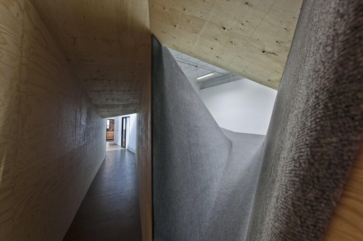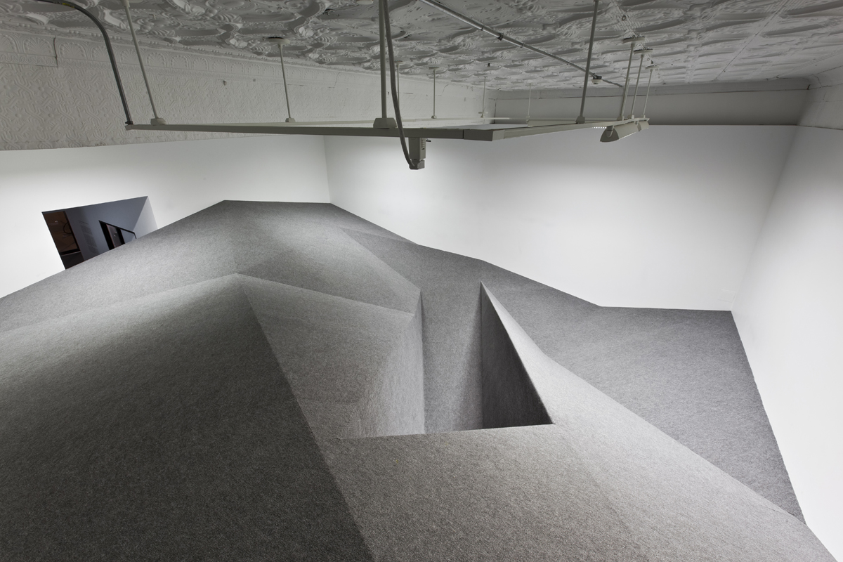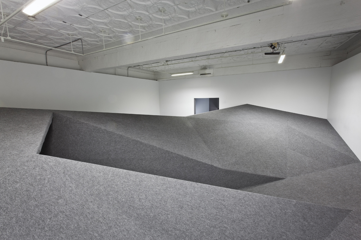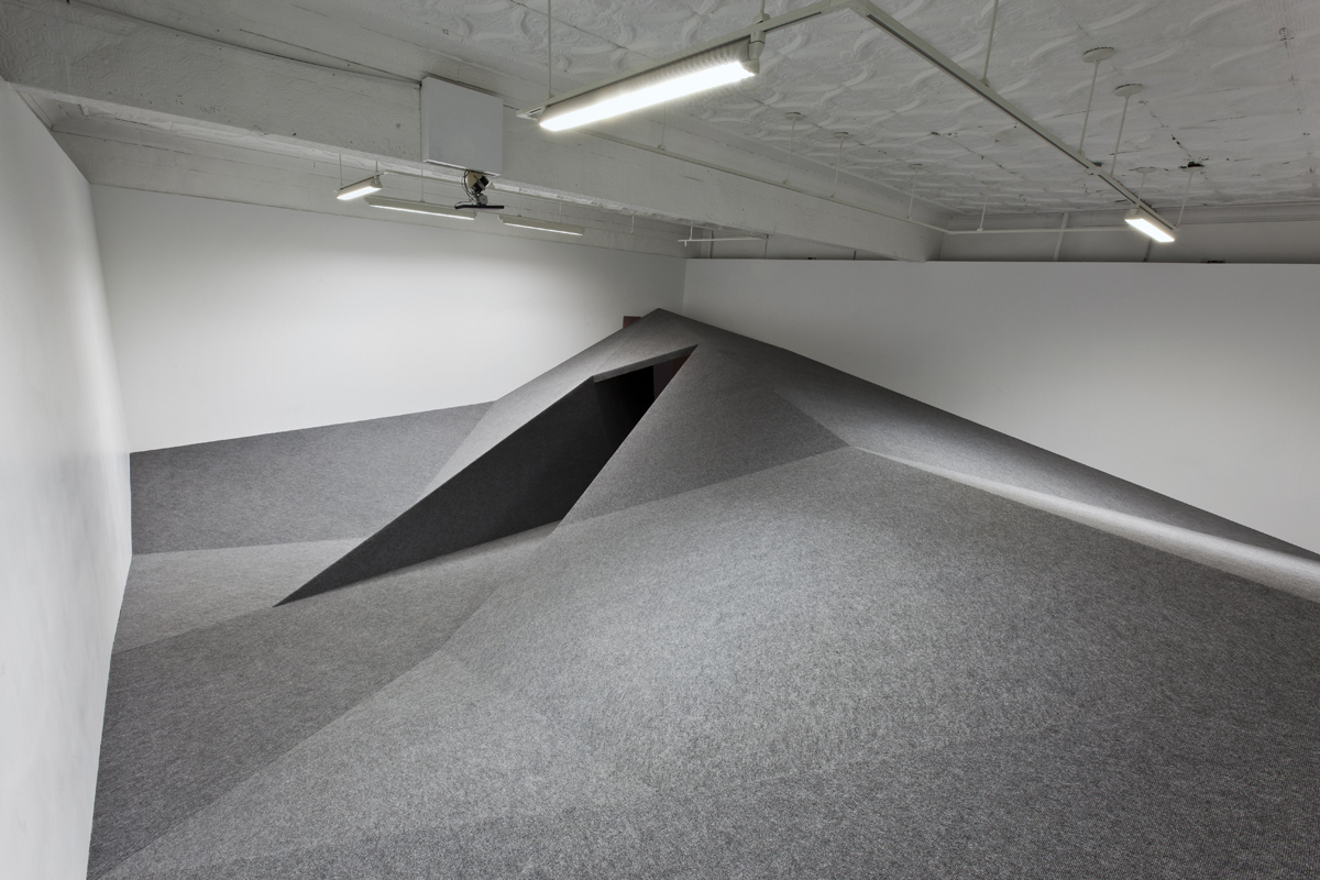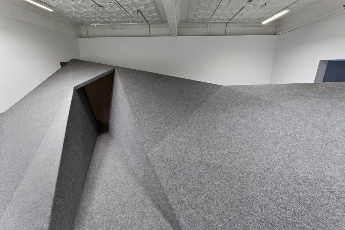 An installation drawing upon the ecological effects of vibration and the history of sonic warfare. Historically, sound has been an ideal medium for the performance of psychological warfare because of how efficiently it evokes events and locations. Whether declarative, as with anthems or artillery, or deceptive, as with sonic decoys or surveillance, the audiosphere is well disposed to militarization. Inside the gallery, aural encounters occur in two strains. One territorial, via the ground walked upon, as much felt as heard; the other aerial, via a sonic beam that occasionally swept the visitor unannounced like a wandering ghost. Instrumentation of the floor composition is comprised of tank maneuvers, explosions, earthquake frequencies, helicopters and other heavy equipment. These field recordings were filtered, processed and edited together with a variety of sine and sawtooth waves. Conceptually, the floor composition suggests the residual infrastructural sounds of military action. Three subwoofers and three buttkickers are installed below the topography upon which the visitor walked and felt the composition. The wandering beam composition is comprised of sirens, trumpets and bagpipes - instrumentation that is traditionally declarative and historically associated with warfare or police states. The instruments were deployed without their traditional melodies, resulting in single notes and drones. This piece was played through an HSS (Hyper Sonic Sound) speaker mounted on a gimbal in the ceiling. This sort of speaker generates a highly directional sound beam which is non-discernable unless the beam is pointed directly at the listener.