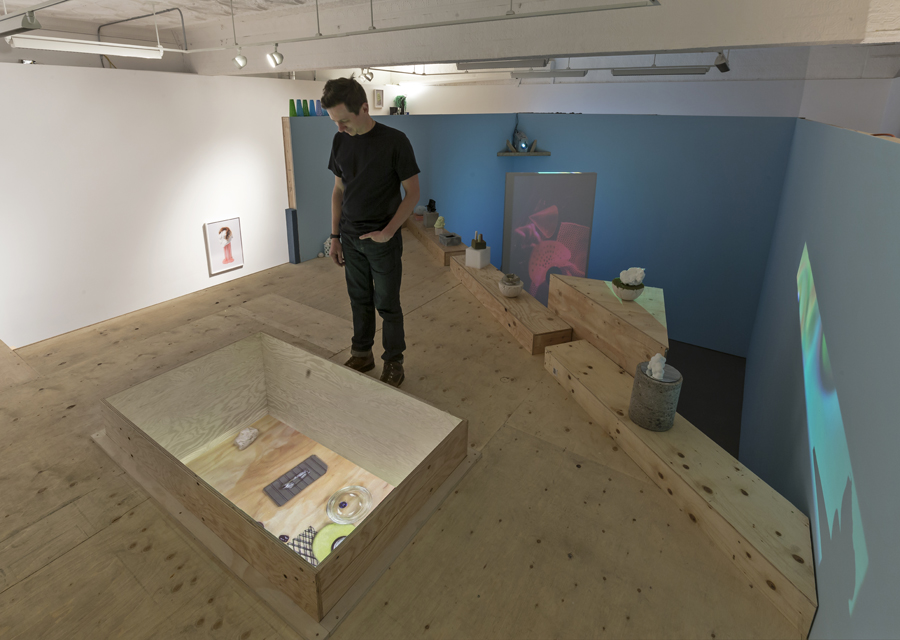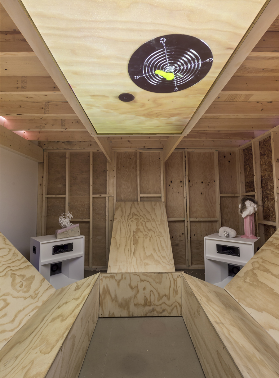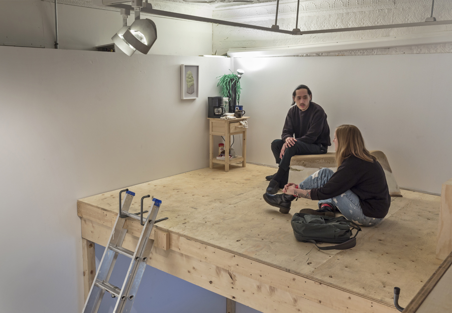 Not together, but alongside explores the potentiality of relationships between the viewer and the artist, the collective and the individual, the gallery and the studio. In their large scale installation sprawling through the front gallery of Mercer Union, platforms become seats, objects perform and the potentiality of action plays out. Their material exploration and unfixed nature in the work conflates the formal and the comedic. The disparate elements that comprise the installation further emphasize its makers as a group of individuals with different ideas and art practices working together. That spirit and the process of discovering alternate viewpoints extends to the gallery visitor, because the experience is a negotiation of both physical bodies in space and what it means to assess or determine: to do or undo, the separation between the studio or gallery, and experiment or art object.