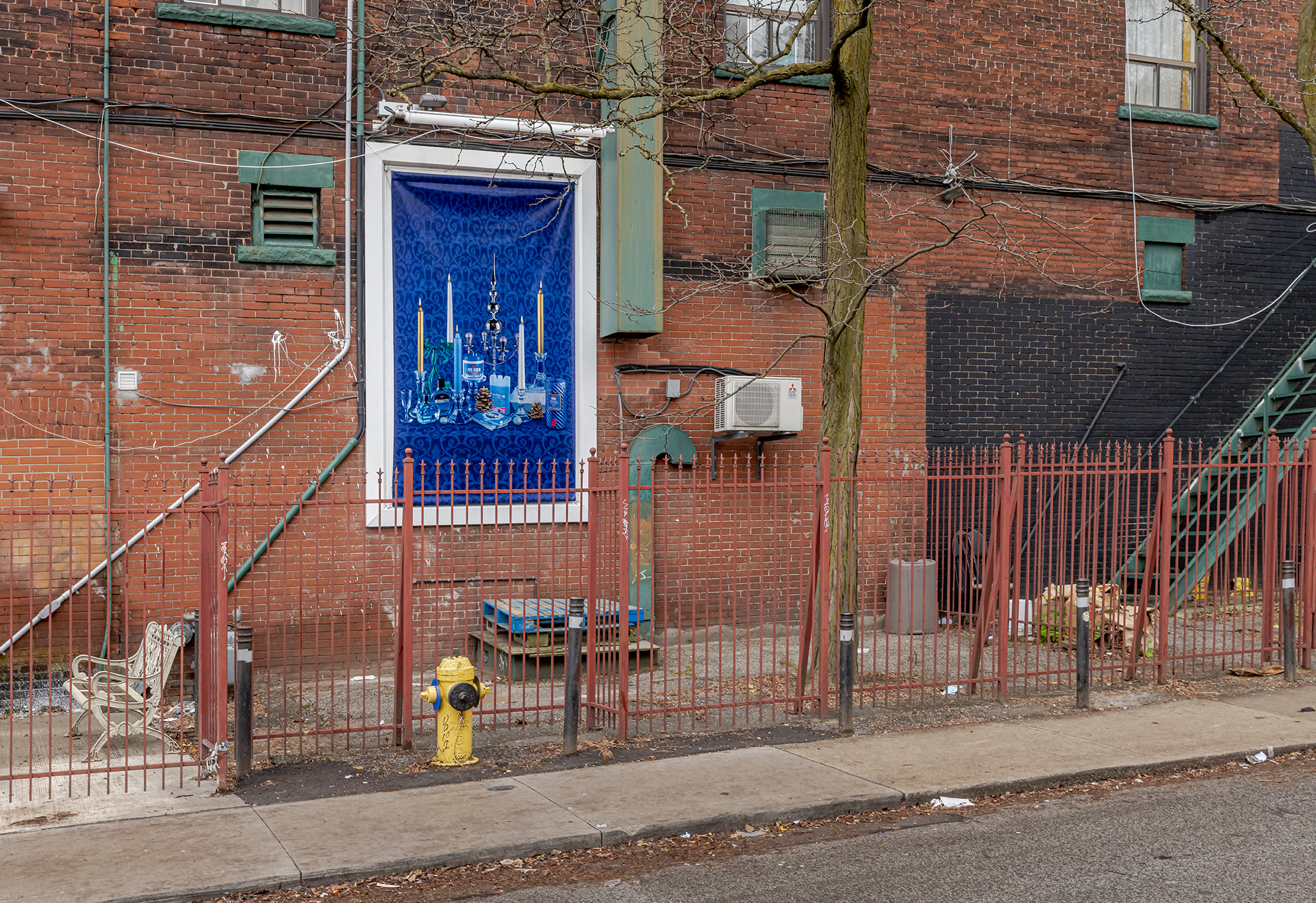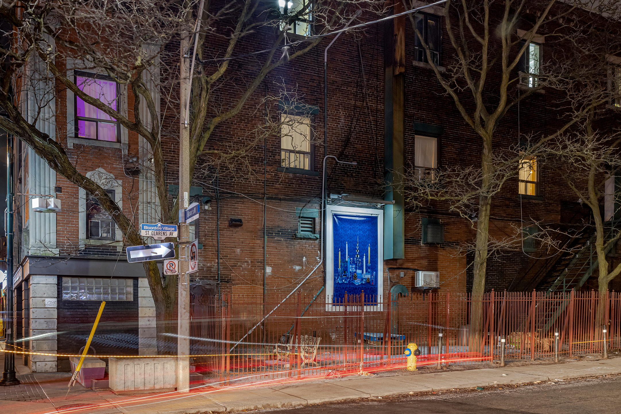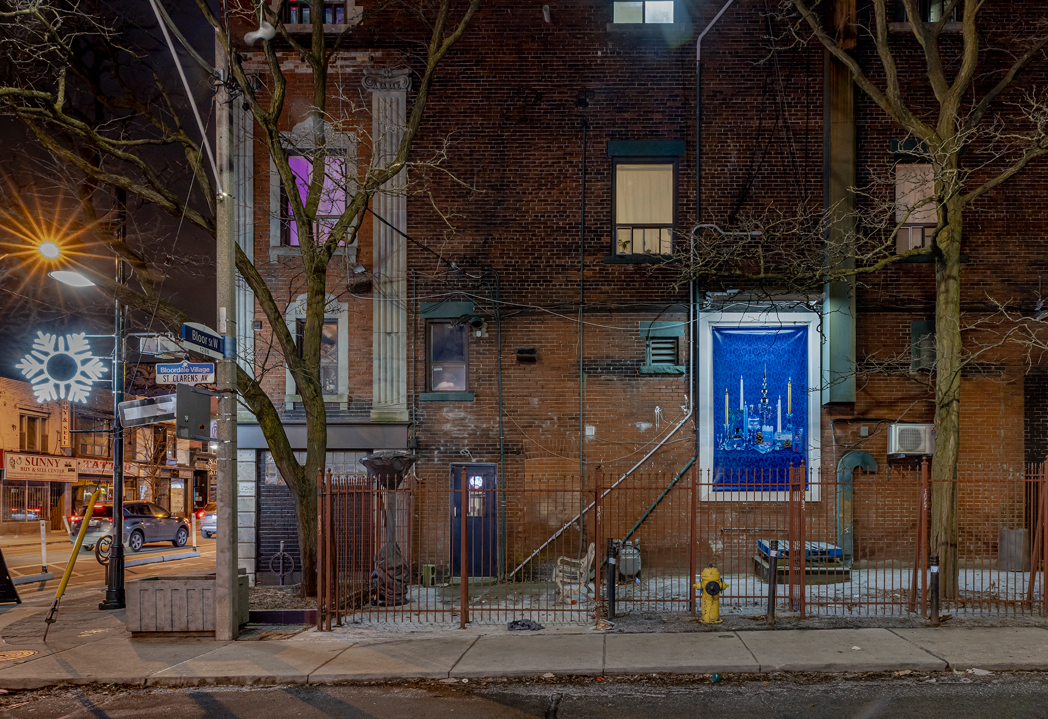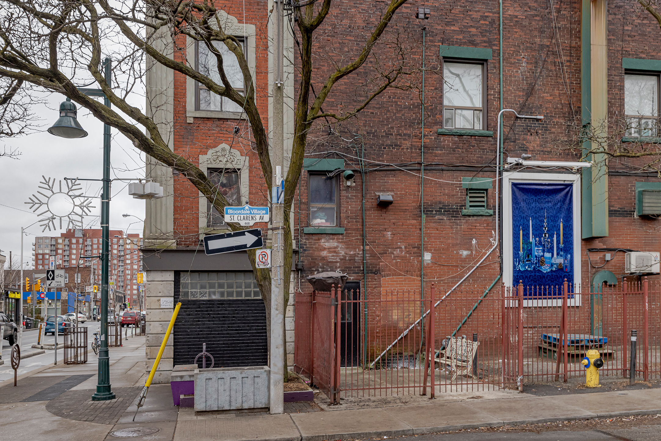 Toronto is a city in flux, and Bloordale is no exception. Beloved businesses and long-term residents have taken heed of rising prices and encroaching developers. Some will vacate, whether willingly or with hands tied; others will persevere, supported by local patronage or the skin of their teeth. Changes will be embraced, rejected, or begrudgingly accepted; advocated for and protested against. Snow will fall, melt, fall again. What is now considered new will one day be old, and what is now considered old will be gone. Unveiled on the side of Mercer Union on the darkest day of the year, An Ode to Winter freezes Bloordale in time. I spotted the still life from a block away, big as a billboard and peaceful as a snowglobe untouched. It was Christmas Eve, unseasonably warm, with COVID cases in the province the highest they’d ever been. What do we do amidst constant change? Take stock of what we have and build an altar.