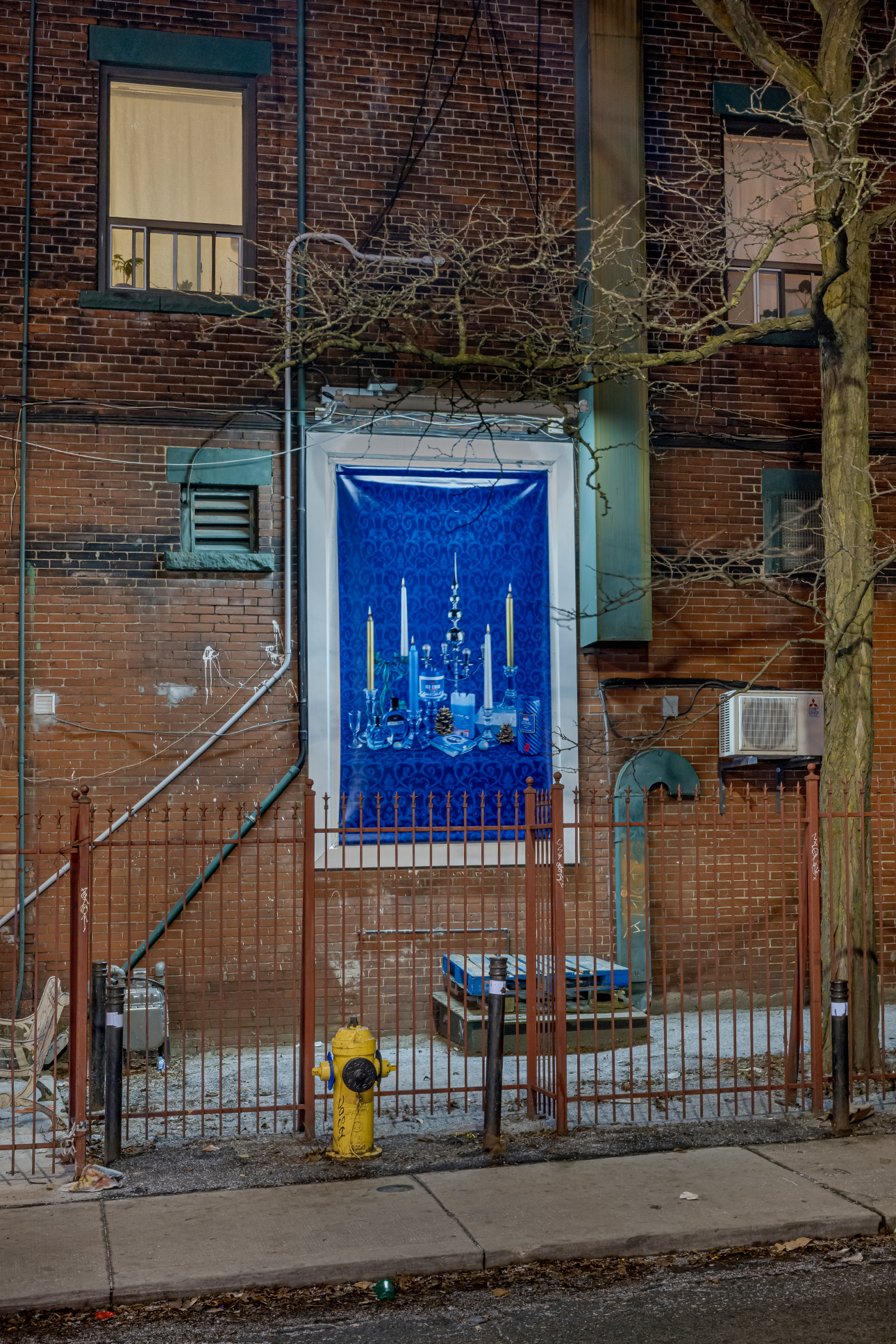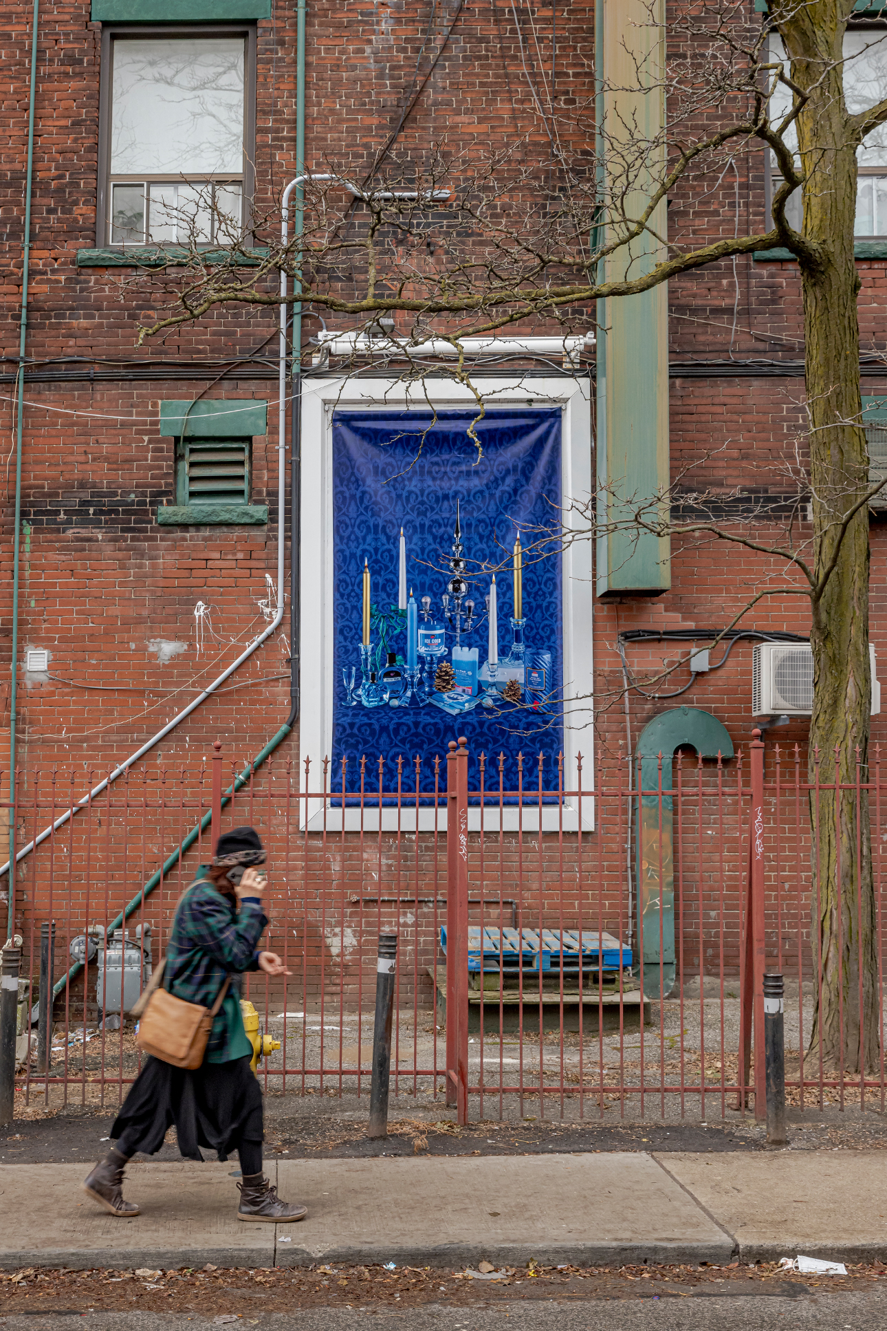 Across town, Shellie Zhang offers a different seasonal altar with Ode to Winter, a royal blue snapshot of the five-minute stroll known as Bloordale Village. The second in a quartet of still life photographs, Ode to Winter presents a portrait of a neighbourhood through a study of what we might find there during the coldest months of the year: a silvery candelabra, its sockets stuffed with silvery balls; a Styrofoam takeout container, lid closed; a pair of pine cones, one big and one small; an ice pack; two sleeves of peppermint gum; metallic candles; decorative crystal; a bottle of Arctic Blue aftershave. Although Bloordale may be small—the entire community fits between two adjacent subway stations, Dufferin to the east and Lansdowne to the west—it’s distinct enough to warrant a name. What makes the area unique, Zhang tells me over the phone, is its lack of demographic specificity. Where else can you find banh mi next to tacos, or a Salvation Army parallel to a gentlemen's club?