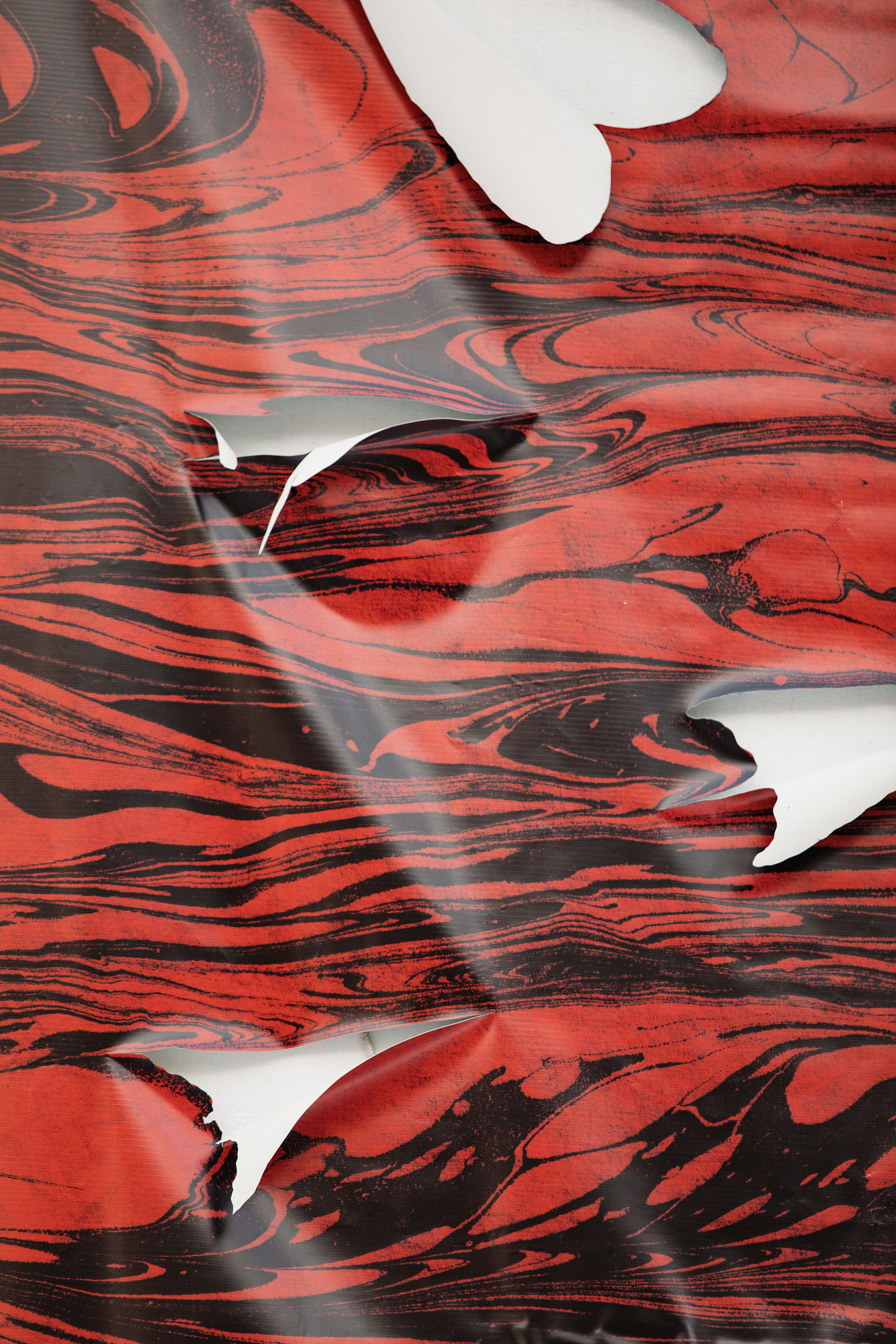 Their recent projects emerge from a longstanding interest in the traditional hydrographic printing technique of Ebru, and include works on textile and paper that resist mastery of conventional patterns in favour of emergent forms. At Mercer Union, the artist performs a sculptural study of the distinct marbled patterns of Ebru by using large-format digital reproduction and physical interventions. The series’ title alludes to the delicate and fundamental act of negotiation between water and suspended natural pigments that is central to the practice of Ebru. The artist explores this notion as a conceptual framework for reading a visual field and introduces a responsive sculptural language of cuts and folds that trace and transform the image.