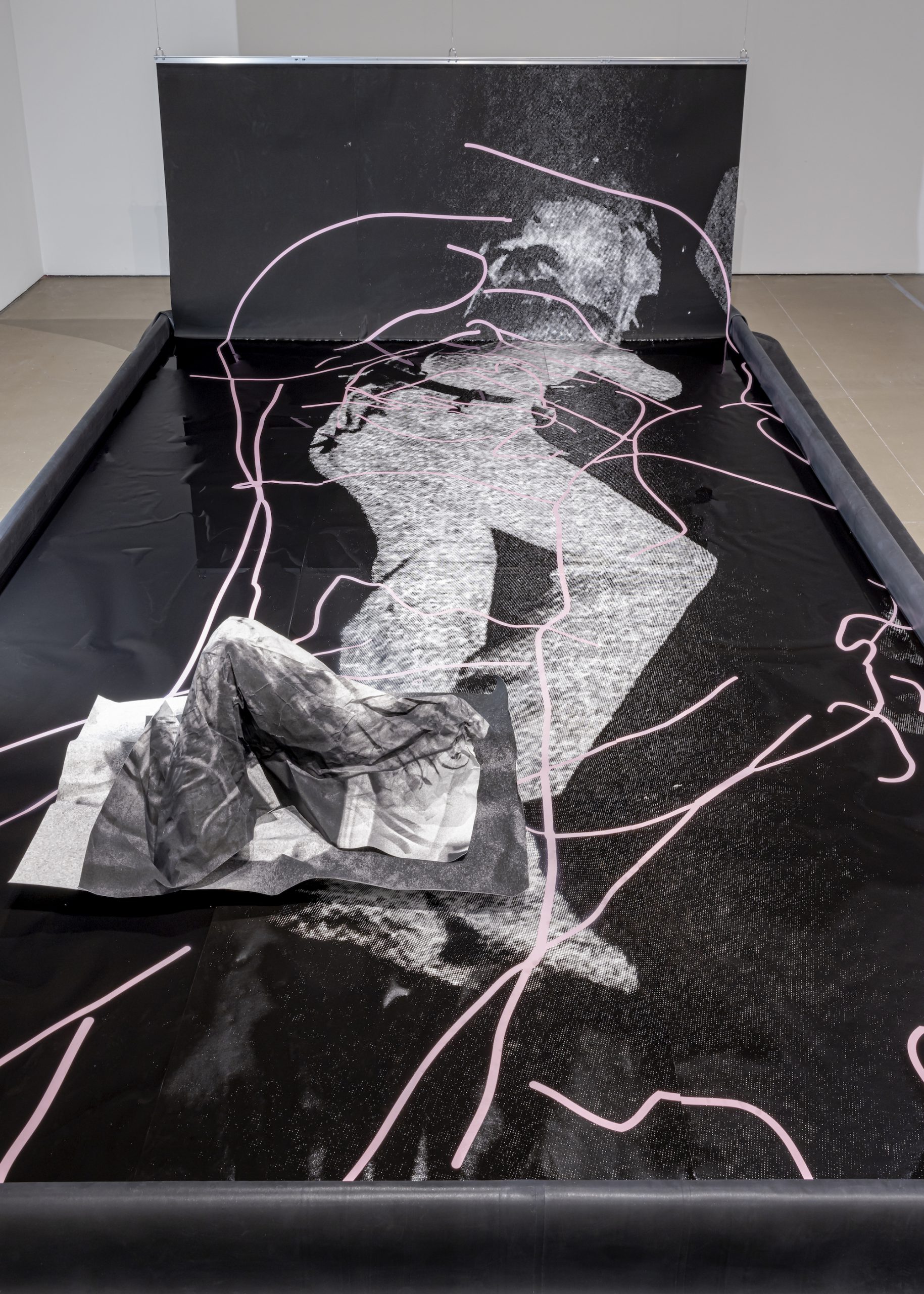 Scryer in the Archive brings together Zito Lema’s sensitive curiosity and autobiographic impulse, to present composite image works that test the possibility of recovering new meaning where history and the present moment stage a visual dialogue. At Mercer Union, the installation comprises a series of large-format reproductions of images from Nuevo Hombre on top of which are printed tracings of figures in family photographs rendered by the artist. Each is installed in a low basin of water that sits directly on the floor of the gallery. These works, together with a series of photographic sculptures that appear to sit on the surface of the water, trace a web of connections from the artist’s childhood through to that of her own children.