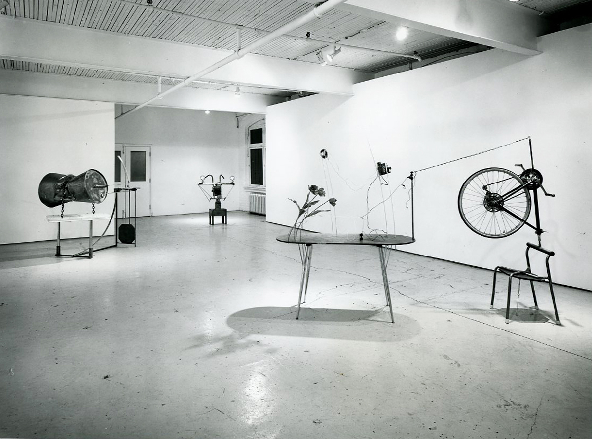 Brenner's work can be read in a way similar to Woodrow's. A major difference lies in the way that Brenner recoups objects from the "real world" such as chairs and tables, which constantly shift between their identity as furniture and as sculpture. For example in the Mystery at Life and Tahiti, real parts of tables are used but other parts such as table surfaces cut out of quarter inch plate steel are interchanged with table legs, changing the table's function so that it is a simulacra of its model in the real world. For example, the chair that accompanies the table in Tahiti looks like a chair but it deviates from its function with the bicycle wheel attachment fixed to it, and the seat, which should normally be placed on top of the frame of the chair is placed underneath It, Establishing a complex relationship of the meaning of things. The bicycle mechanism generates the power to run the transistor radio and the little lights, strung out on stalks, placed amongst the plastic tulips on the surface of the table. This piece (as for the others in the show) has to be activated by the viewer, setting in motion a complex sequence of events passing through time.