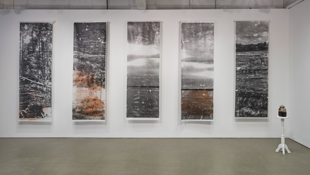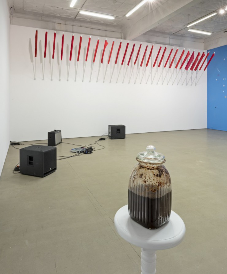 The artists in this exhibition mine transnational counter-flows, cultural dispersions from geographical or social peripheries and alternative representations. Emerging and reclaimed ecologies and sovereignties underline the narratives of colonial trade routes, rebellion and migration in Brewster's work, are the result of the entanglements that comprise Hartt's fictions, mapped out in Frei Njootli's sound work and inferred by the visual dissolution in Baghriche’s installations.