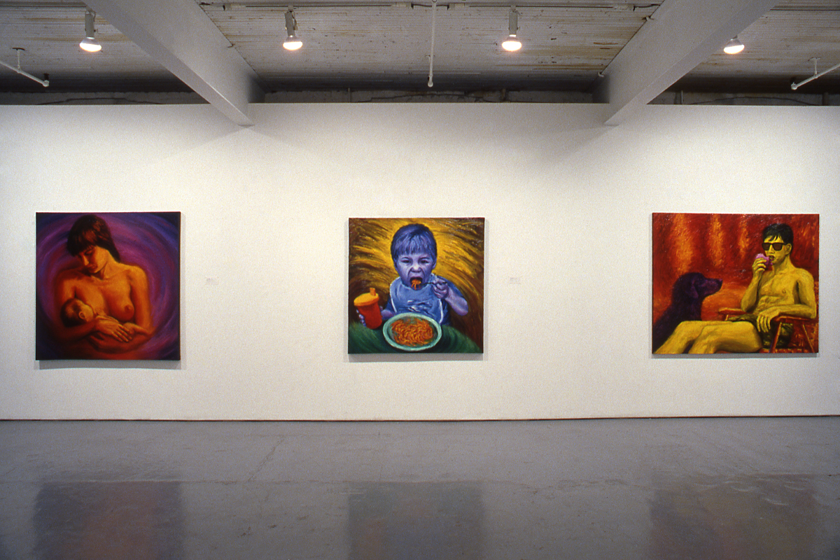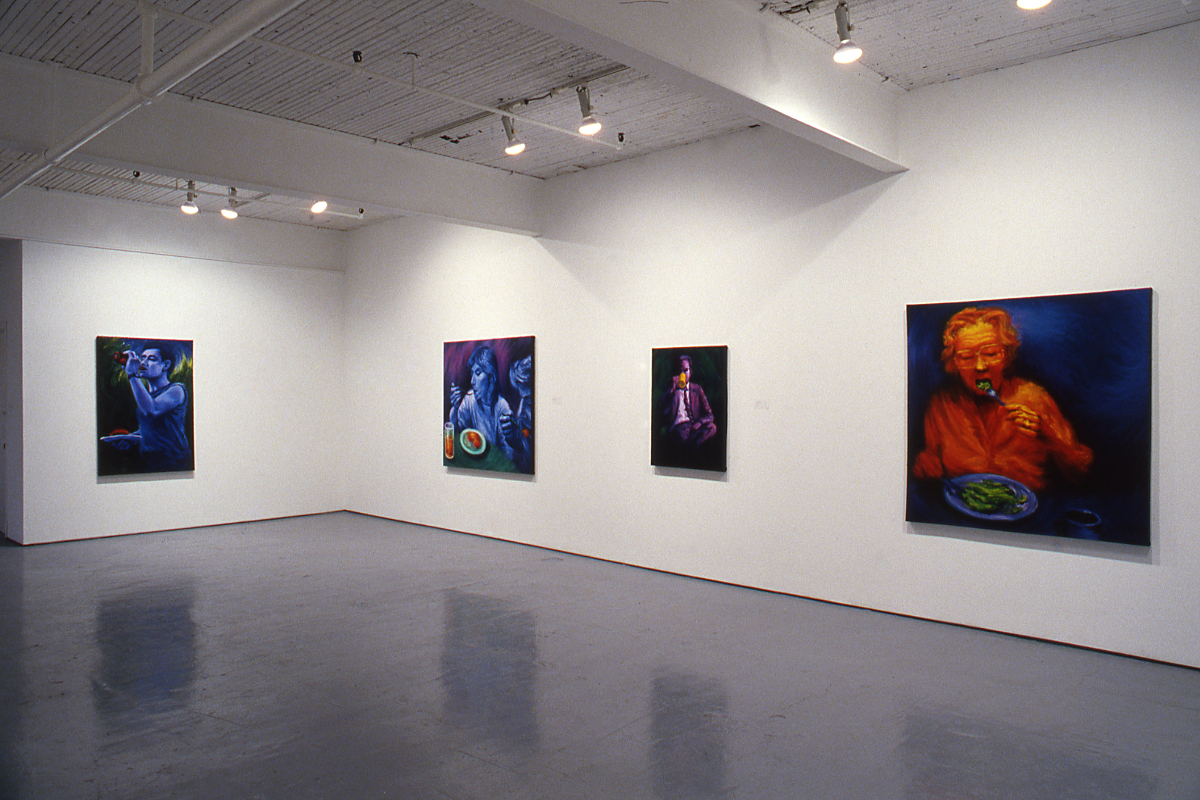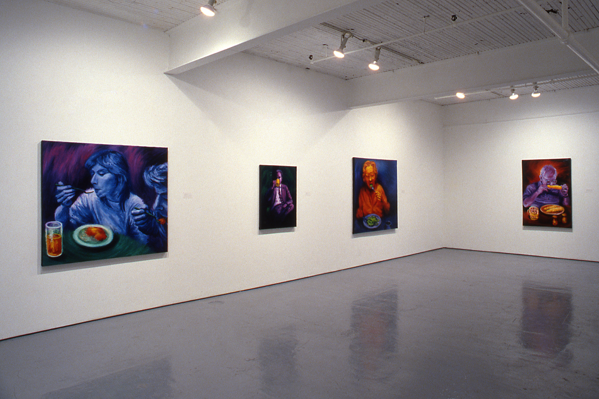 His large oil on canvas works in this exhibitions concentrate on the depiction of figured engaged in eating. A unicultural activity, the regular consumption of food and drink is integral to the structuring of human life and offers a focal point for family, social and business interaction. Although portraying a common motif, Hudson relies on the use of vivid, contrasting hues. His subjective and unnaturalistic coloration separates his work from genre painting and offers a new perspective on an everyday occurrence. Dan E. Hudson's exhibition opens in Mercer Union's East Gallery Tuesday June 28, 8:00pm and continues through Saturday July 23.