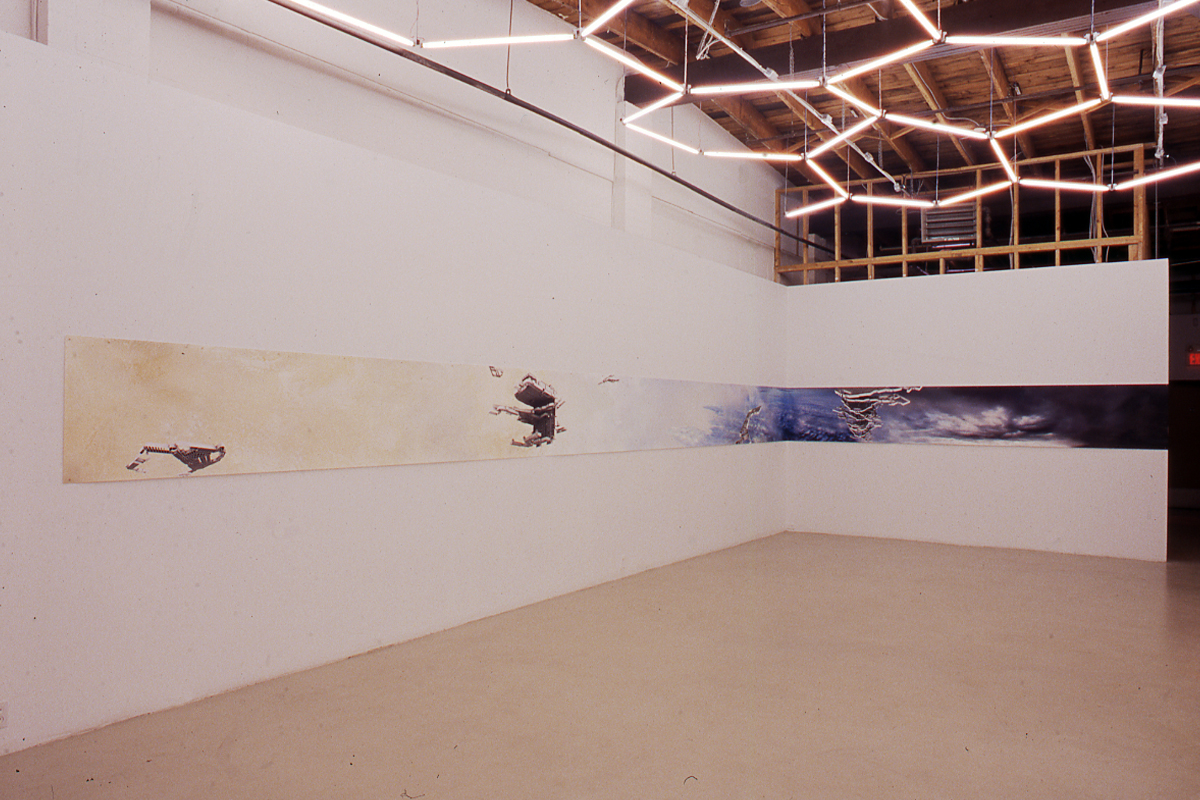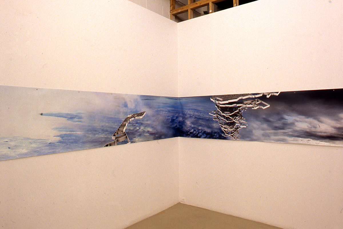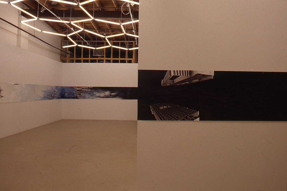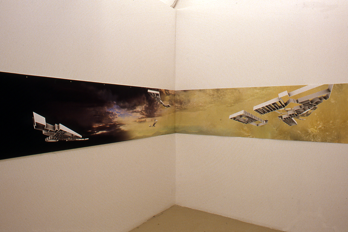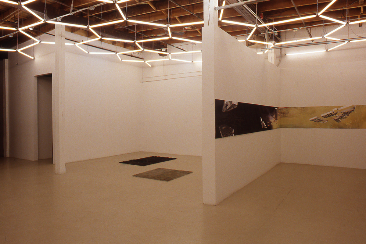 It is fitting that the first study of the North American Chinatown is reconfigured in Ether in a large panorama, the most appropriate form to carry historical narratives of military conquest. The panoramic scene is printed on Tyvek, that Dupont product that Federal Express uses for its envelopes. This industrial material, which is both lightweight and resilient to ensure the speed and efficacy of the global courier service, is unrolled like a continuous scroll across the wall. What has been lost or contained (which amounts to the same thing) in both Migratory Studies and Ether is a history of movement and labour—the early history of garment factories, slave labour, and work camps that underpins the development of Chinatowns in North America. Instead, in both of these studies of urban sprawl there is an “ether effect,” a numbing lack of distinction and affect. The metal outlines of the malls are, as befits the society of the spectacle, both banal and spectacular.