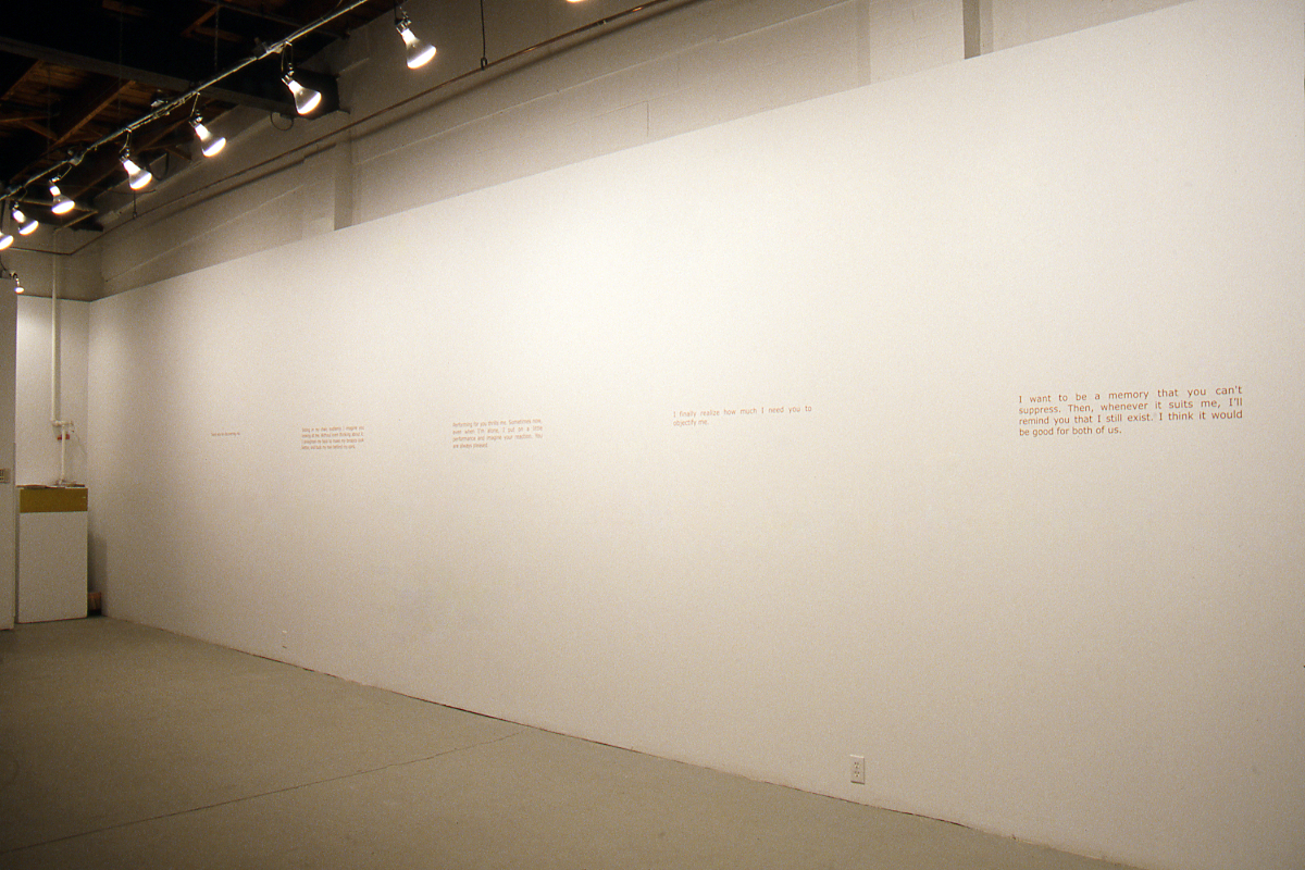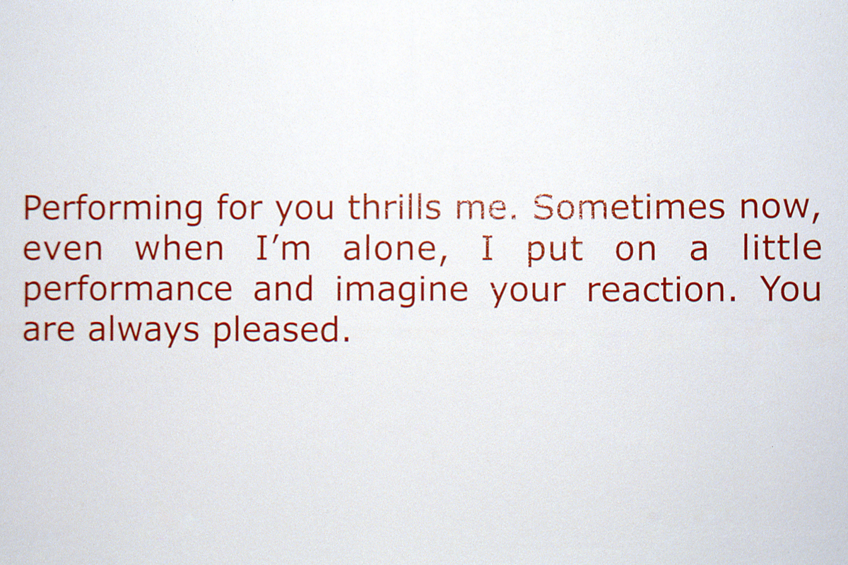 Much of the work in First Person can be seen as autobiographical. However, each of the artists exhibited are proudly and painfully aware of what it means to attempt such a communication within a society of spectacle where identity often becomes simply another product for consumption or just one more arbitrary sign. While the interpretive space of an art exhibition is clearly not immune to a mode of attention based on spectacle, it is exactly within this tendency towards an objectifying and reductive consumption that each of these works becomes compellingly resistant. Refusing the project of summarizing themselves for us, their modes of direct address block our unconscious consumption and make us aware of the way we relate and perceive.