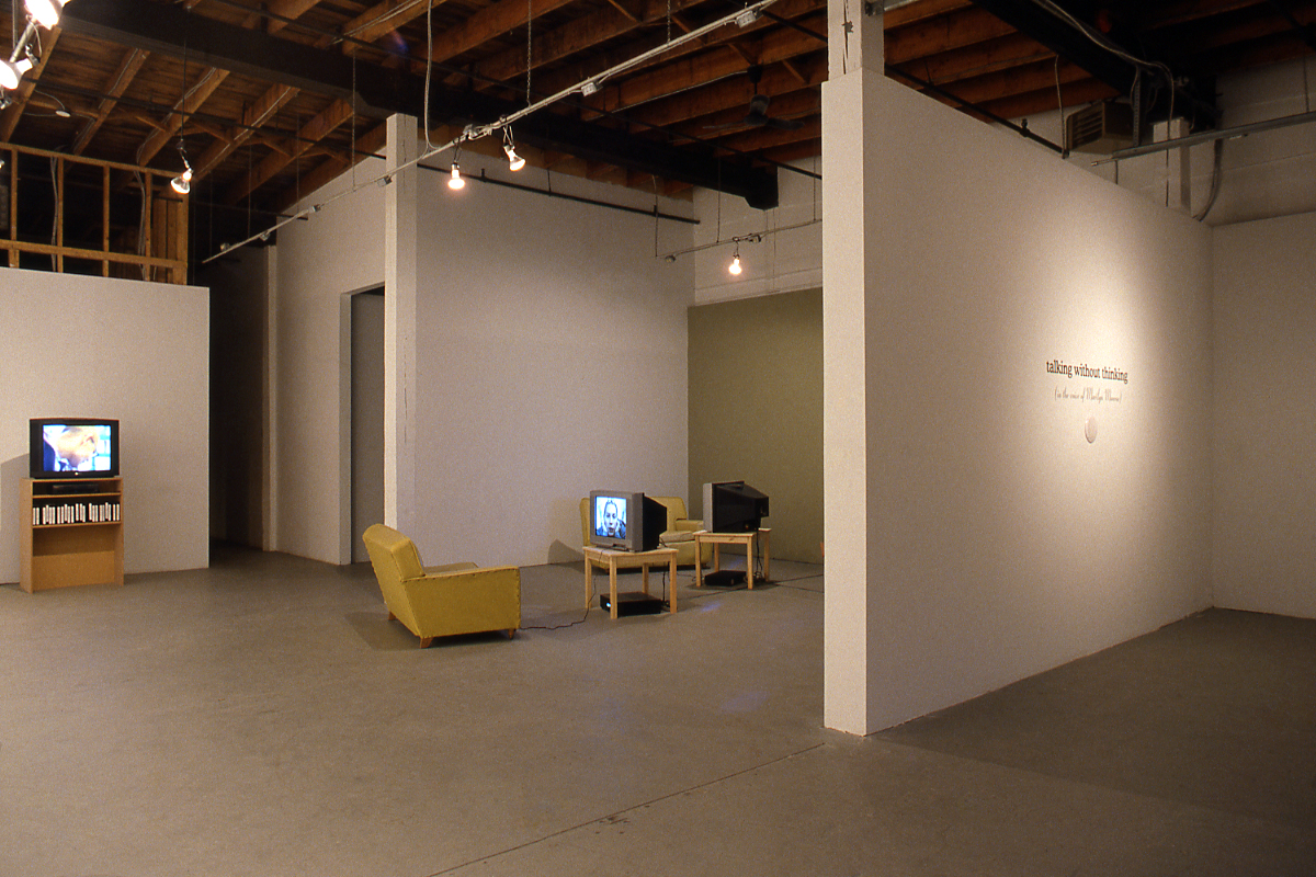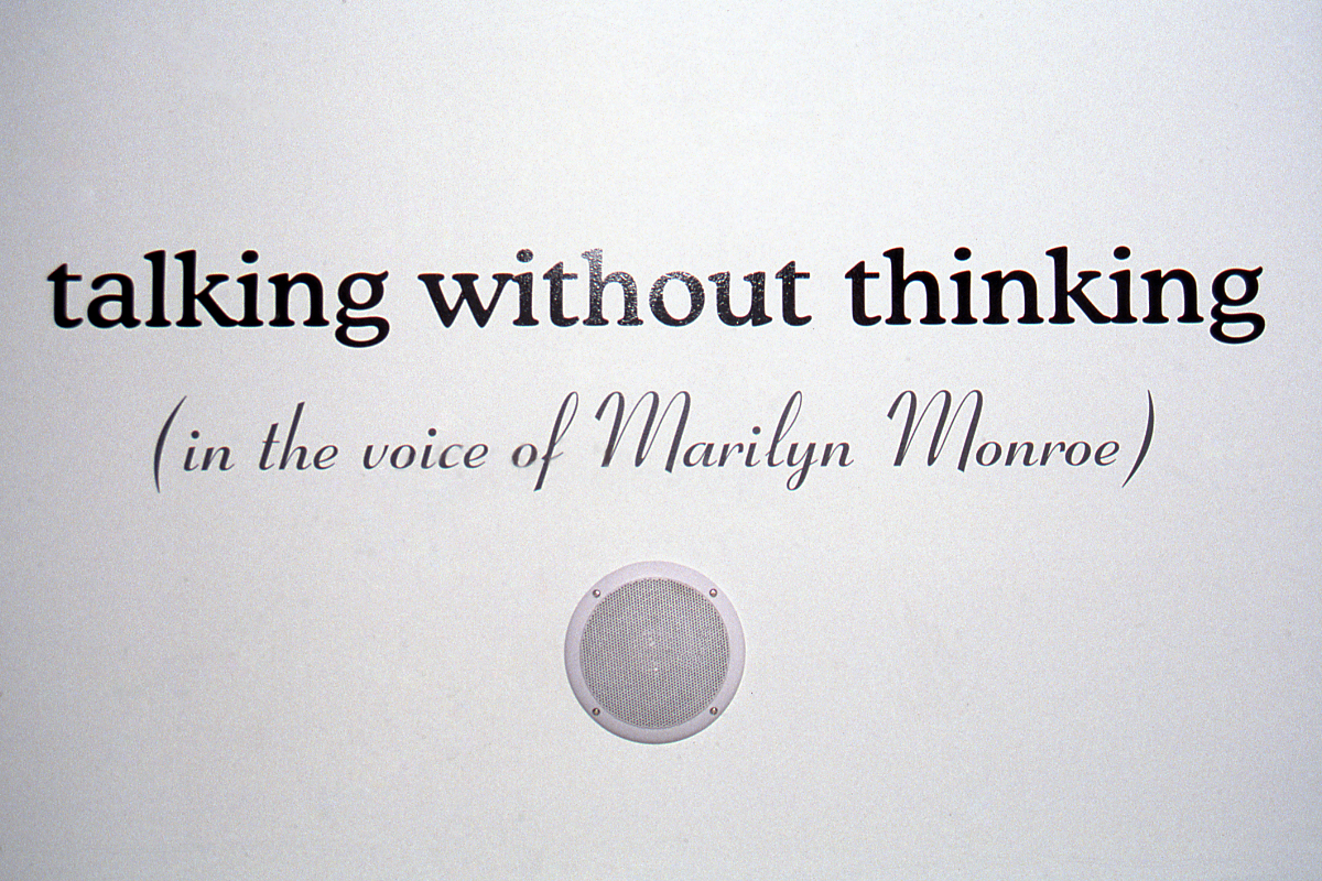 In a related deconstructive turn, Jonathan Horowitz’s sound work Talking without Thinking (in the Voice of Marilyn Monroe) takes us through an unedited, unrehearsed monologue. Painfully attempting to perform the voice of Marilyn Monroe, Horowitz investigates how identity is constructed or perceived through the aesthetics of voice. Questioning the voice, its texture and pitch, as a cultural construct, Horowitz’s work is a performative gesture, its very action and process creating what it struggles to describe. Throughout the first-person monologue, Horowitz discusses the impetus for such an experiment and what happens while he tries to speak in such a voice. What comes out is a simultaneously annoying and entertaining, thoughtful and touching series of associations, identifications, and memories as he tries to describe what changing his voice does to him physically, emotionally, and how he imagines it would mark him socially. The artist’s self-reflexive talk with himself becomes a way to get as close as possible to having a spontaneous conversation about his work with an audience. Horowitz plays with the construct of direct address using the voice to experiment with the possibilities and limitations of communication in contemporary art.