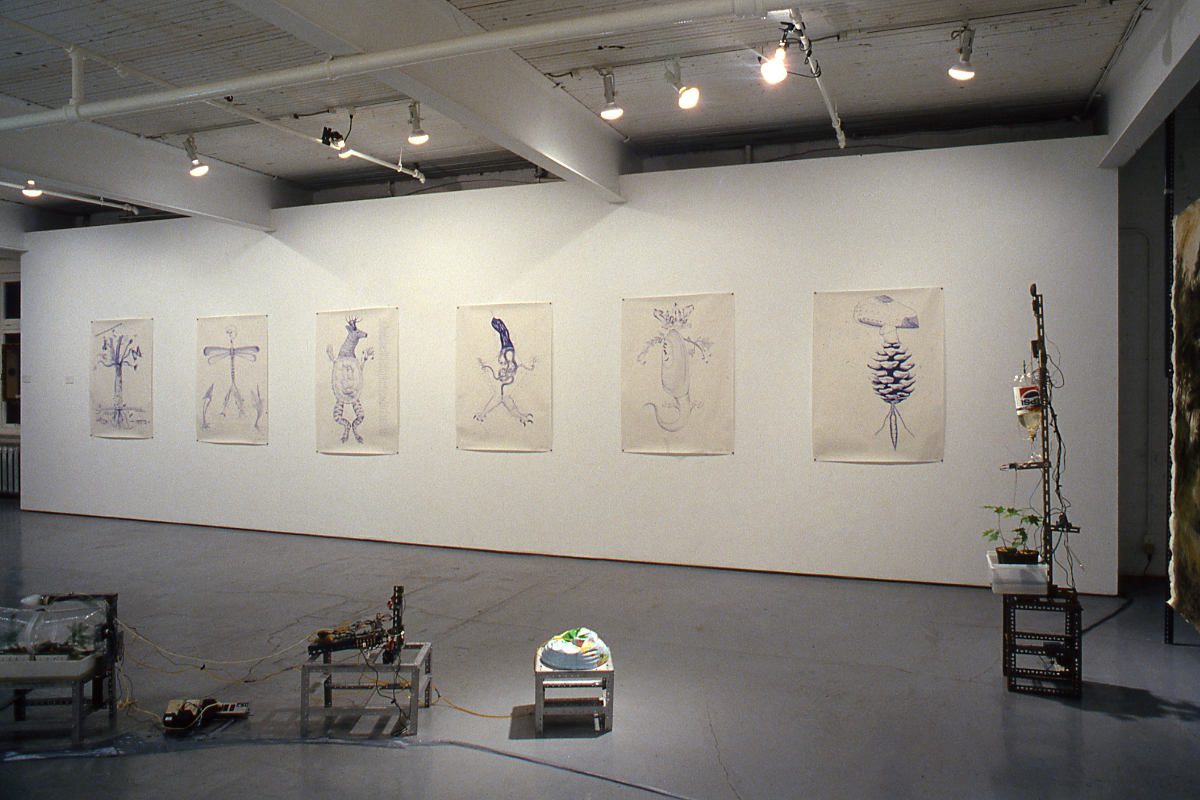 Mercer Union's west gallery looks less like an art gallery these days than a high-school science fair. One display, controlled by electric gadgetry, features a drip of water falling intermittently from an up ended plastic Pepsi bottle onto perky maple seedlings, while another assembly involves a neon ring, more electric gadgetry, and some leeches with nothing to leech onto. (These hapless creatures, swimming around their tank, are more elegant than you might have imagined.) There are crickets in micro-environments consisting of plastic bags and life-support tubing, wiring and so forth, and quite a few fanciful drawings.