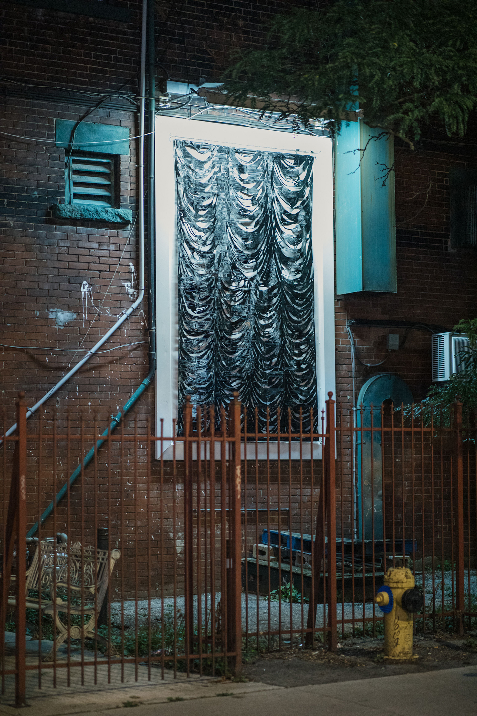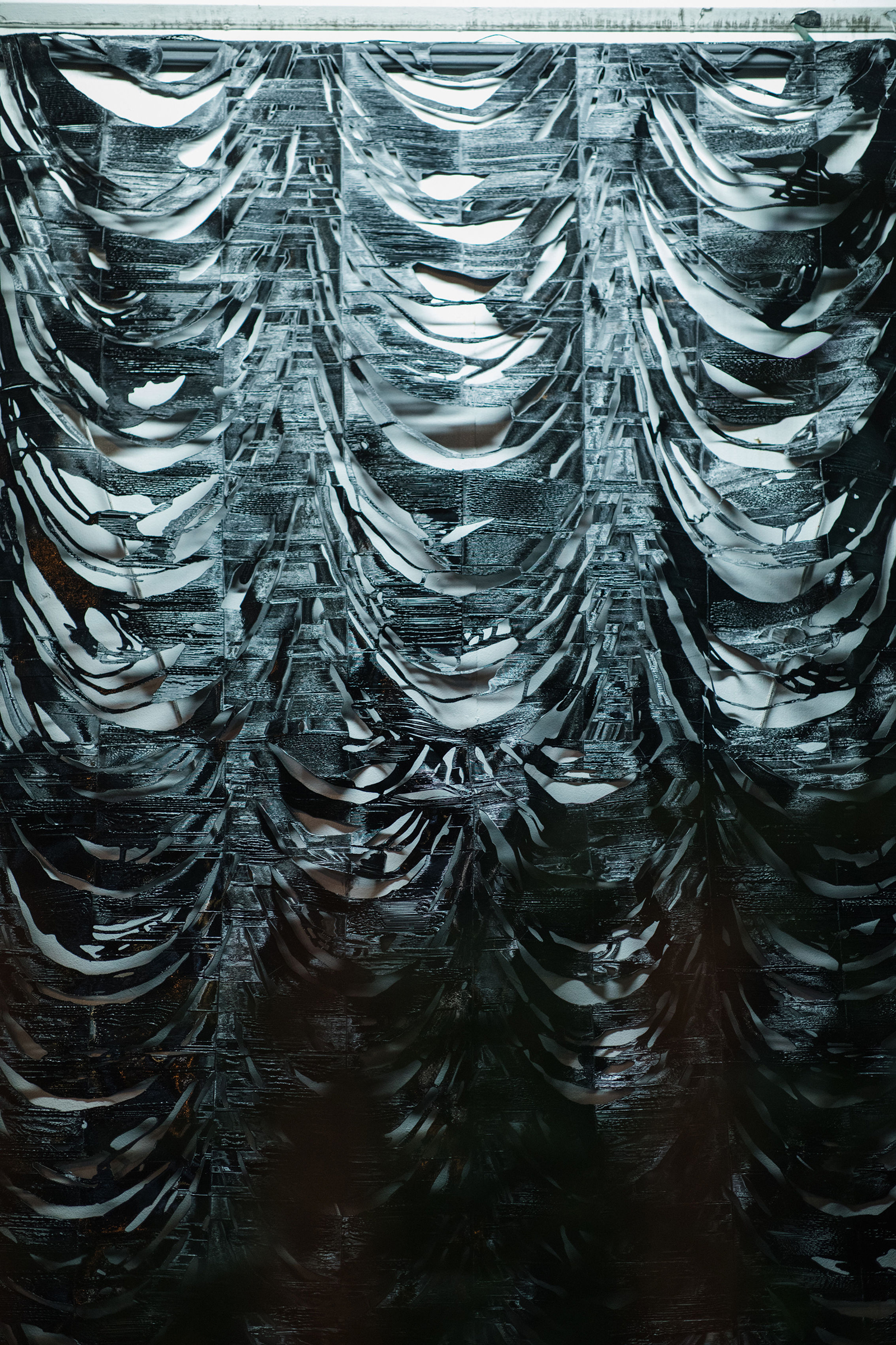 Working with materials such as photo emulsion, plastic filament, and various sheer fabrics, Jealousy presents three sculptural works, each forging an impression of the one before to form a series of abstracted theatrical drapes. Prompted by the history of Mercer Union’s building as a cinema in the early part of the last century, these works come together as adverts for a fictional premiere: a new film adaptation of Alain Robbe-Grillet’s 1957 novel La Jalousie. Noting the double-meaning of the title (“jealousy” or “louvered window”), Kubba attunes to the history and architecture of the building, taking cues from the various mediating forms punctuating its façade—vents, chutes, and other porous passages—that elicit transgression and permit the senses to travel.