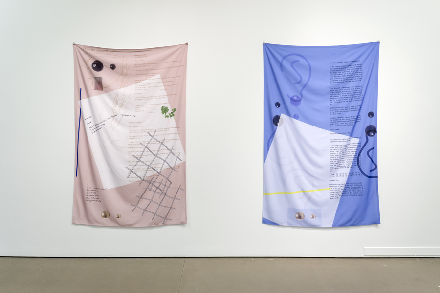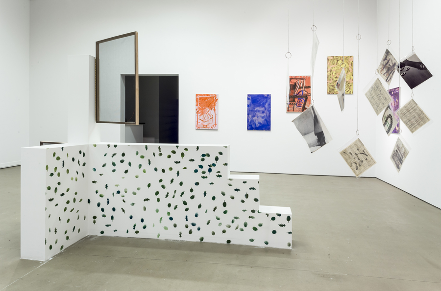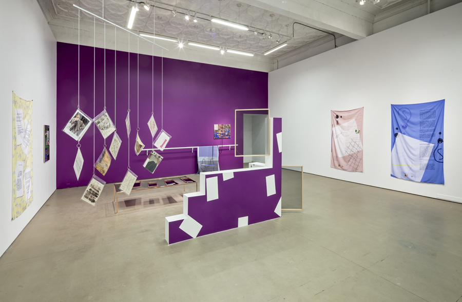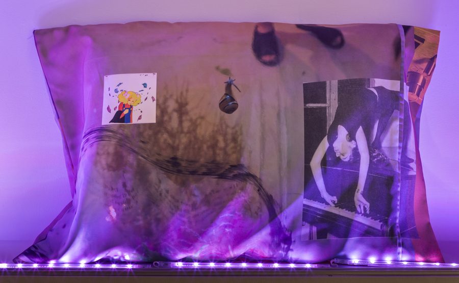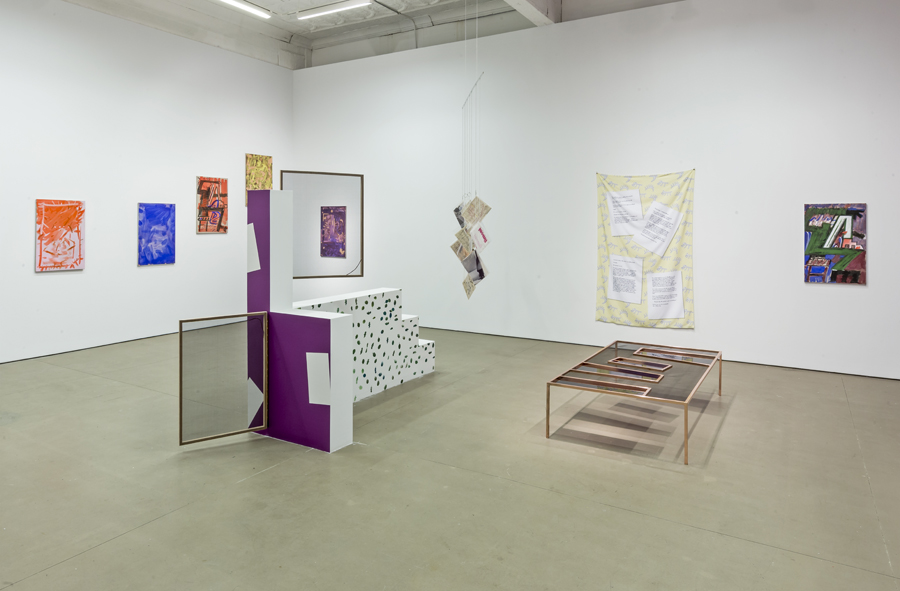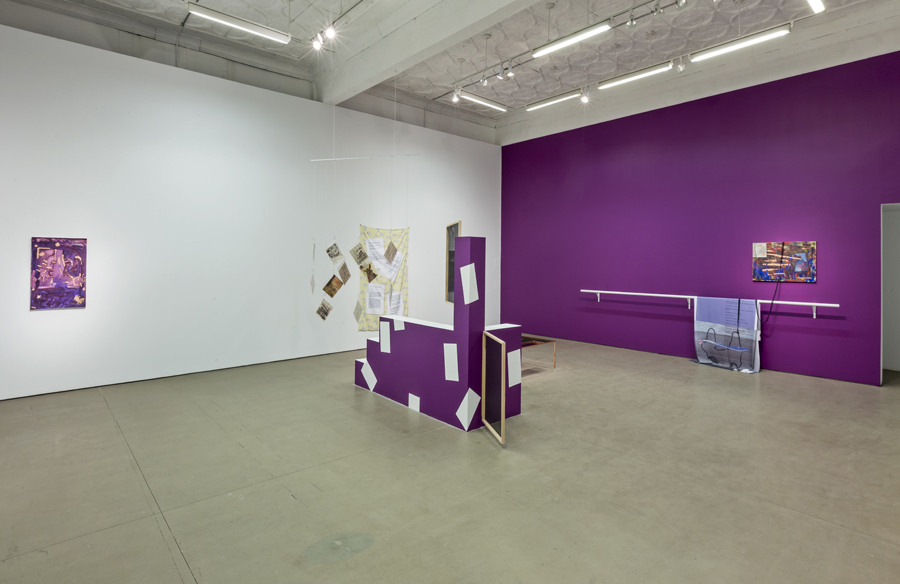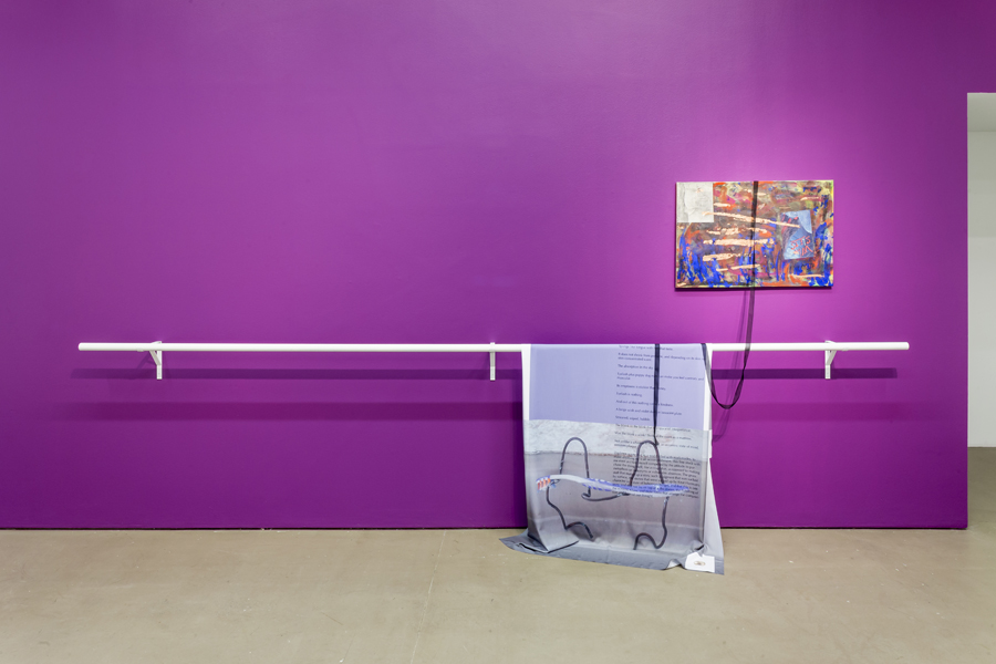 In this new body of work a series of sequences are presented; hanging photographic collages, a metallic and purple bed, screens, paintings are no longer windows but doors, and a line is drawn along the gallery wall to stretch and physically push one’s limits. The potentiality of interplay manifests in the exhibition title, The Eyelash and the Monochrome. The line, a cursor with connotations of femininity and luck, is adjoined to the blank canvas, rather than painterly in reference, it implicates the presence of absence, spaces in which there is potential for new narratives to be created.