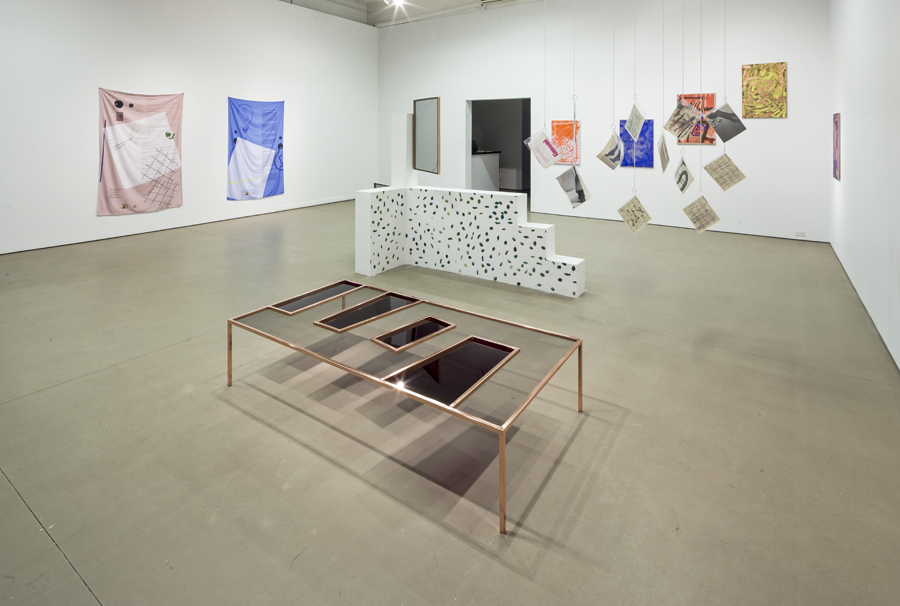 Writing is often the starting point, from poem to script to play. Poetry lines become work titles, transforming the written word into the physical space of the gallery, or walls become pages, unfolding narratives populated by objects and materials. The exhibition is a space in which hierarchies collapse, theatre, poetry, writing, mythological female figures, personal narratives and popular culture are combined and meaning becomes elastic in form. Transmutability lingers throughout the work, in a photographic collage, Surface Instruction (2011), a worn apron becomes an oversized handbag while a twin table with pink glass emerges and recedes as Janis Joplin’s rose-tinted glasses in Aquarium Club Console (Janis) (2014). And yet underlying sometimes playful juxtapositions are historical instances and trajectories. Live snails drawing on plastic speaks to the use of their shells in making the colour purple for women only manuscripts, becoming in of itself purple prose.