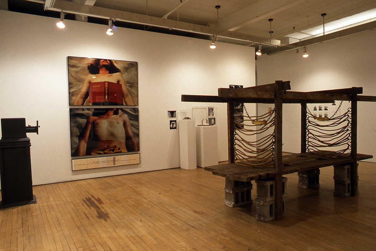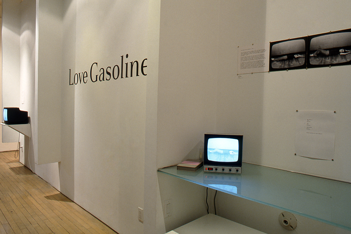 Love Gasoline includes works in a diversity of media (sculpture, photo-based work, performance, and video), and traces several common themes. A general crisis of the object (registering in the dematerialization of the art object) corresponds with a loss of the love object, and an attendant (narcissistic) spiraling inward on a wounded self. Chris Burden nails himself to a Volkswagen Beetle, and exposes himself to the risk of being electrocuted; Dennis Oppenheim gets himself sun-burned; Michael Snow stages his own "death" in Venice; and Lisa Steele shows off all the scars on her body. Other themes include a sense of self-consciousness, evident in the play in front of and for the camera; it is accompanied by an emergent role-crisis, role-change and gender-transgression in art. Martha Wilson poses in drag and Vito Acconci stages himself as a woman. Registering the effects of the camera, the works in this exhibition exchange erotic glances for a sometimes violent cross-fire of looks, and in that process draw attention to subjectivity as a social fact, as a role played out in the visual field.