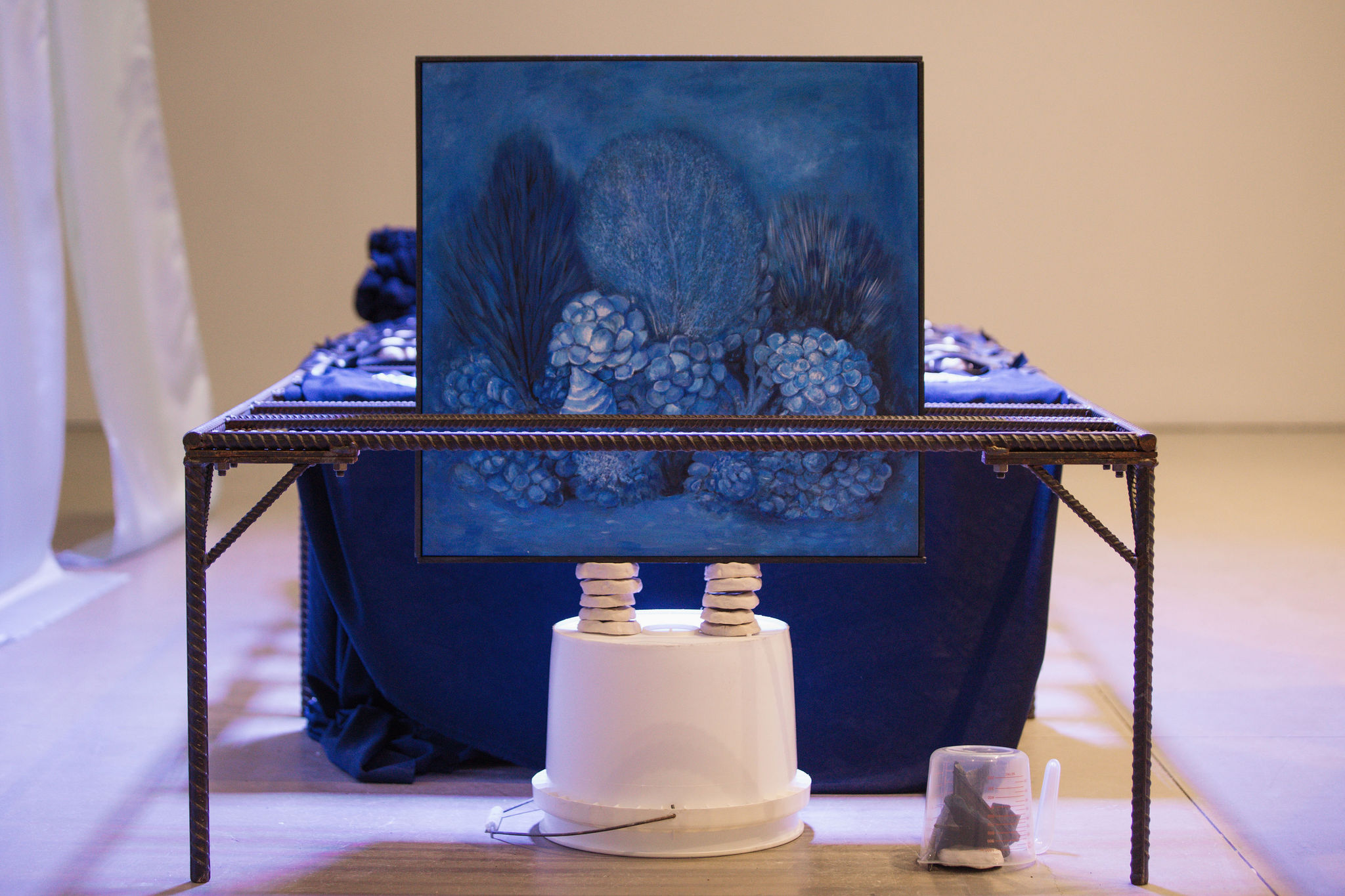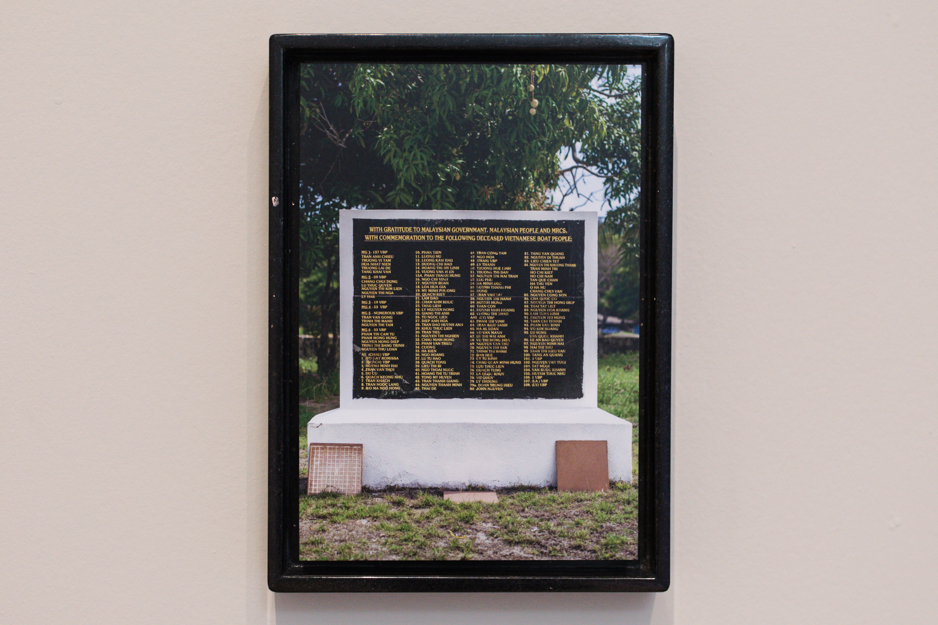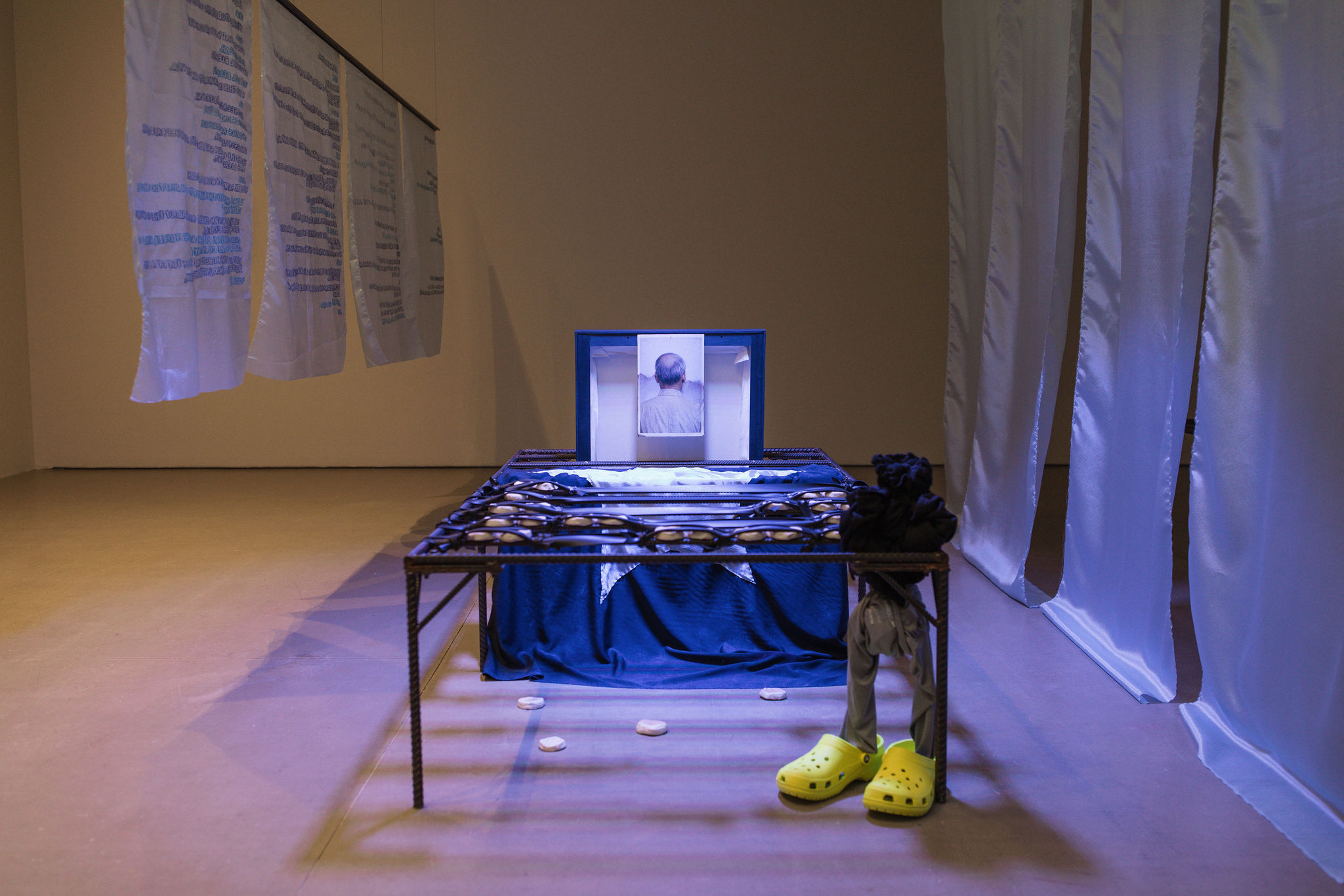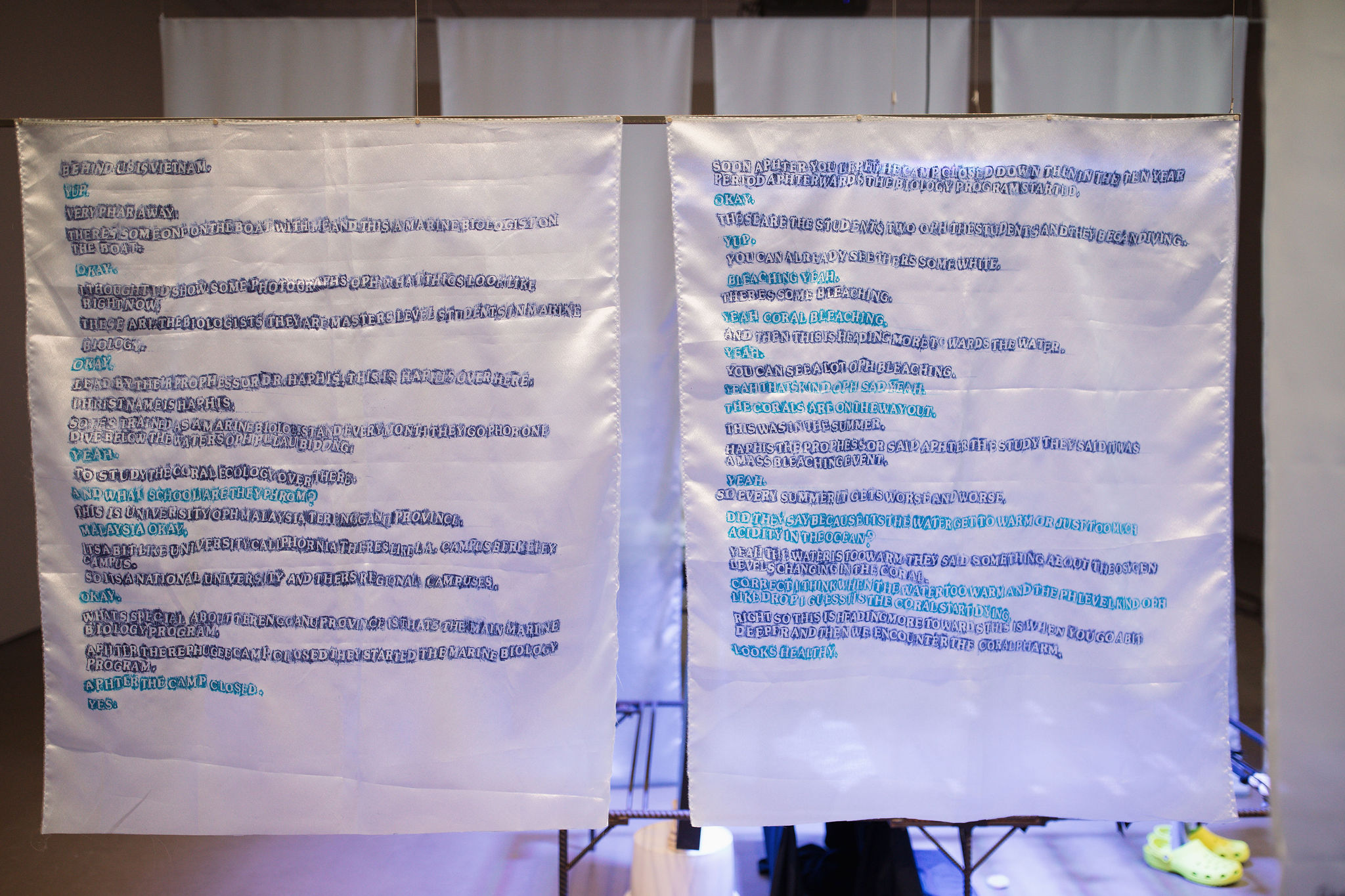 At Mercer Union, Luong’s film is situated within an installation of sculptures and frottage works. Eight fabric banners bear the film’s transcript of the understated exchange between Luong and Nguyen. Created by making rubbings of a mass grave tombstone in Kuala Terengganu, Malaysia, the suspended frottage works spell out the film’s dialogue while imbuing it with the presence of the refugees who drowned at sea enroute to Bidong. Formed letter by letter with the names of the deceased, these layered documents contend with the insufficiency of both mortality and memorialization. Anchoring the film are a series of steel rebar sculptures: one presented as an autonomous assemblage and two others that act as seating for the film. Luong borrows the form of structures used to farm corals on the Bidong seafloor, which bear an eerie resemblance to bed frames and evoke refuge. By collapsing spaces of life and death, and folding multiple geographies into intimate encounter, Luong’s exhibition offers a space that is neither origin nor destination, where the complexity of displacement and the fullness of human experience can be held without the need for resolution.