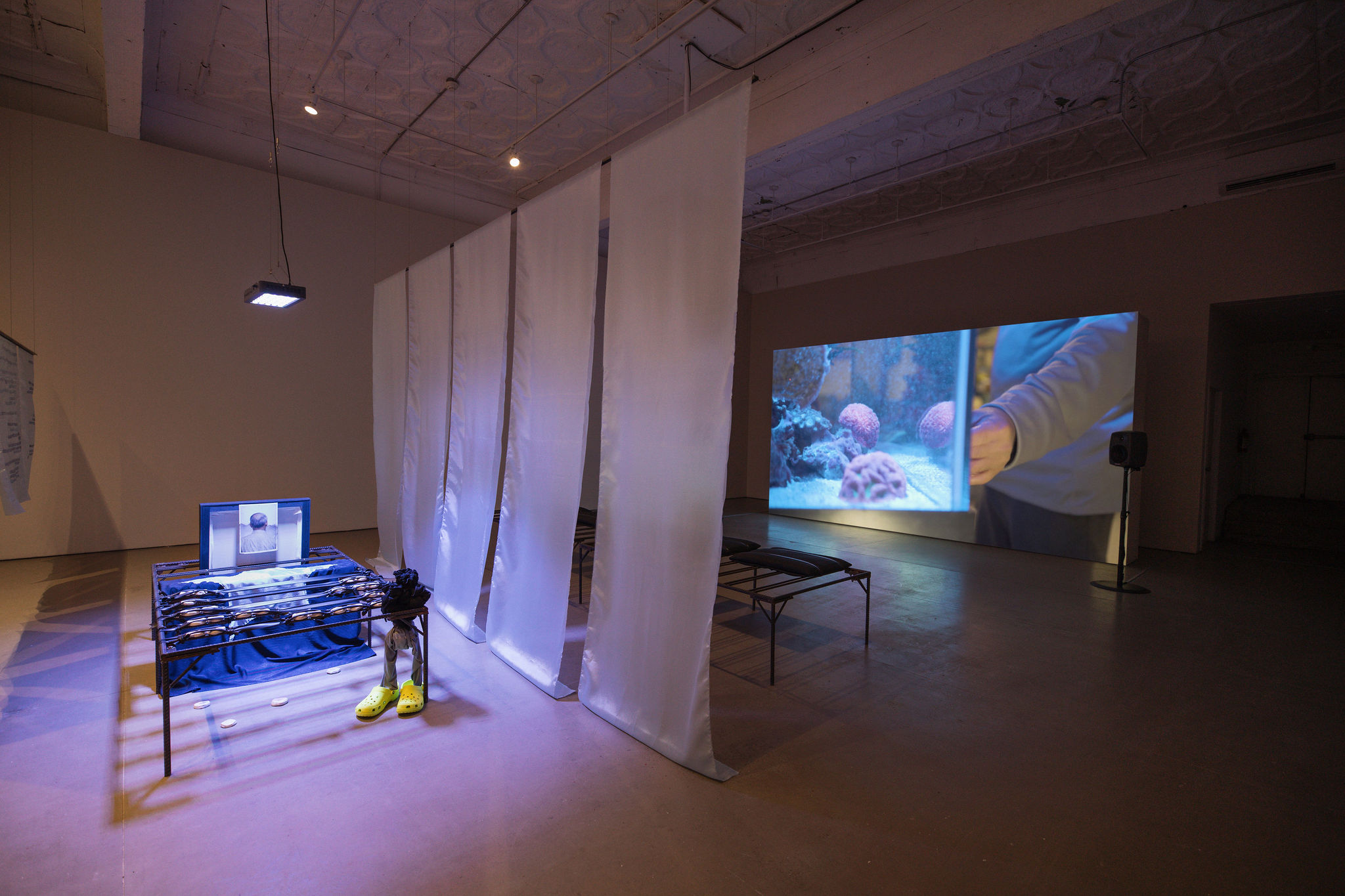 Throughout his multidisciplinary practice, Luong uses strategies such as reenactment and reconstruction to recoup moments from the past and to cast them anew against the conditions of contemporary life. DEPHINITELY PARADISE is the final work in a trilogy of films where Luong pursues the analogies between Bidong’s refugees and the rehabilitated corals cultivated there today for export, often to many of the same countries where the refugees resettled. In Nguyen, Luong finds a subject who encapsulates the complexity of Bidong’s history of migration and trade. As the film pans across the aquariums meticulously built and maintained by Nguyen in his Connecticut home, a melancholy vọng cổ ballad—scored by Rắn Cạp Đuôi Collective and made from audio samples of Nguyen’s aquarium equipment—offers a poetic imagining of reincarnated undersea lives finding refuge in Nguyen's care.