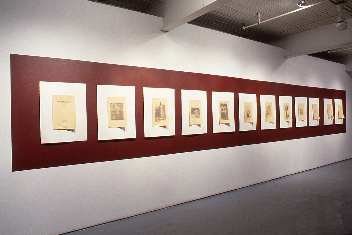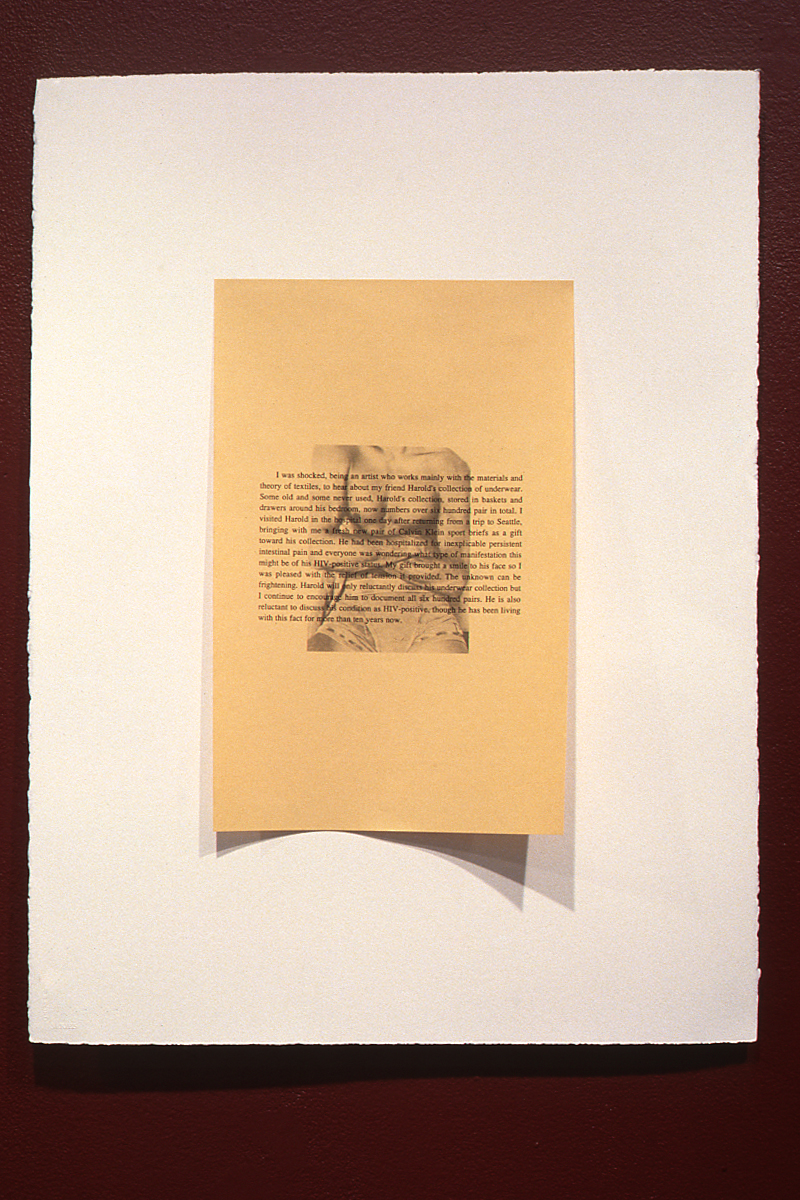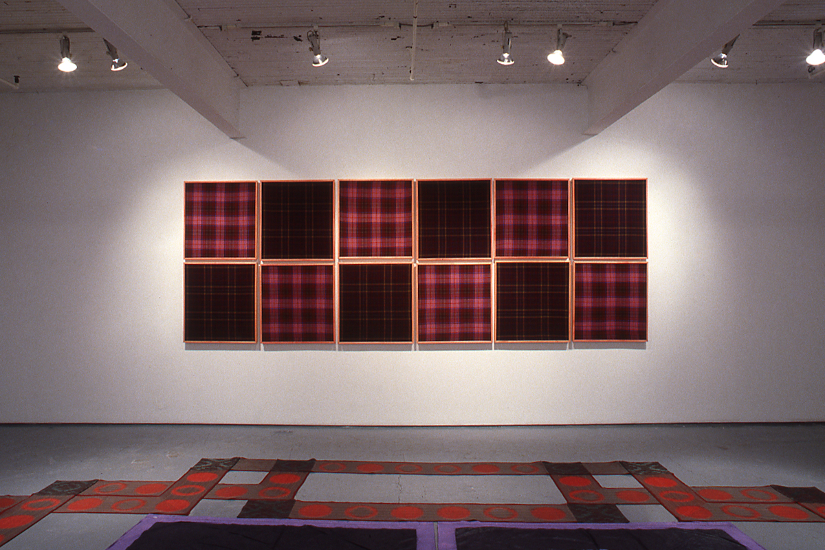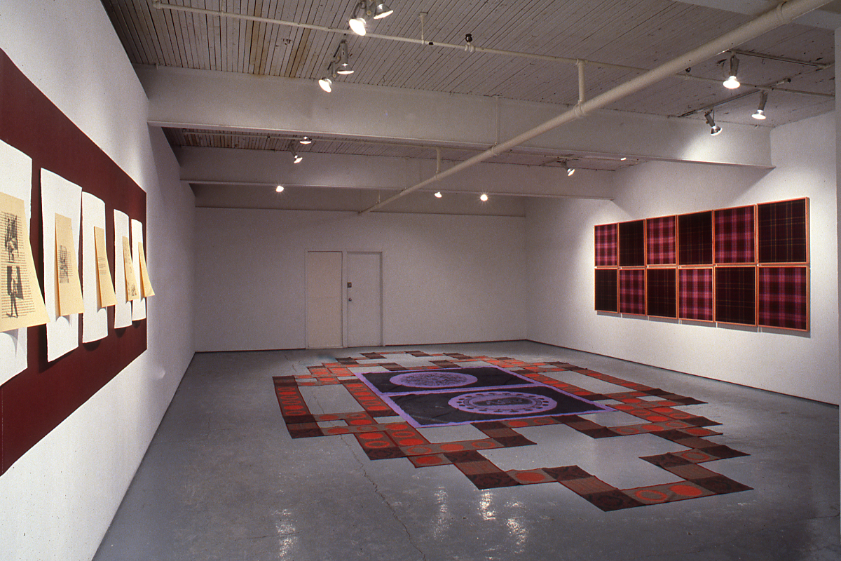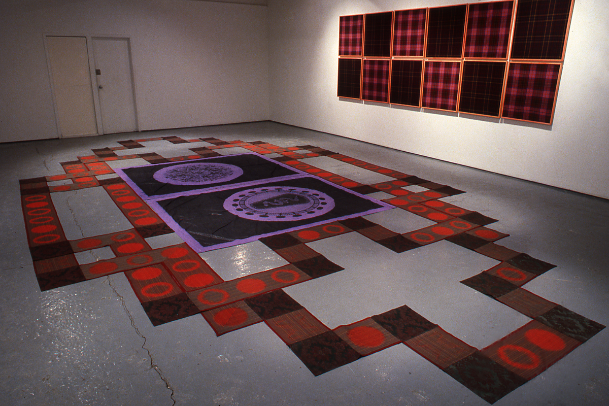 MacInnis' installation +/- consists of an interlacing ribbon of fabric that extends to the outer perimeters of the gallery. The network of cloth consists of alternating squares of computer-aided, hadwoven cloth with a repeating and high stylized graphic representation of an HIV-infected blood cell and a commercially produced brocade fabric of a decorative floral motif. In a layout reminiscent of CEltic patterning, the cloth intertwines around two large central images delicately drawn in graphite on lilac-dyed bed sheets. One represents a highly decorative Victorian floral ornament, the other is a representation of a microscopic image of the RNA coding of an infected cell. Twelve panels of altering tartans designed and woven by MacInnis title Queer Basing and Gay Nineties propose a reclaiming and redefining of the notion of "family" or "community."