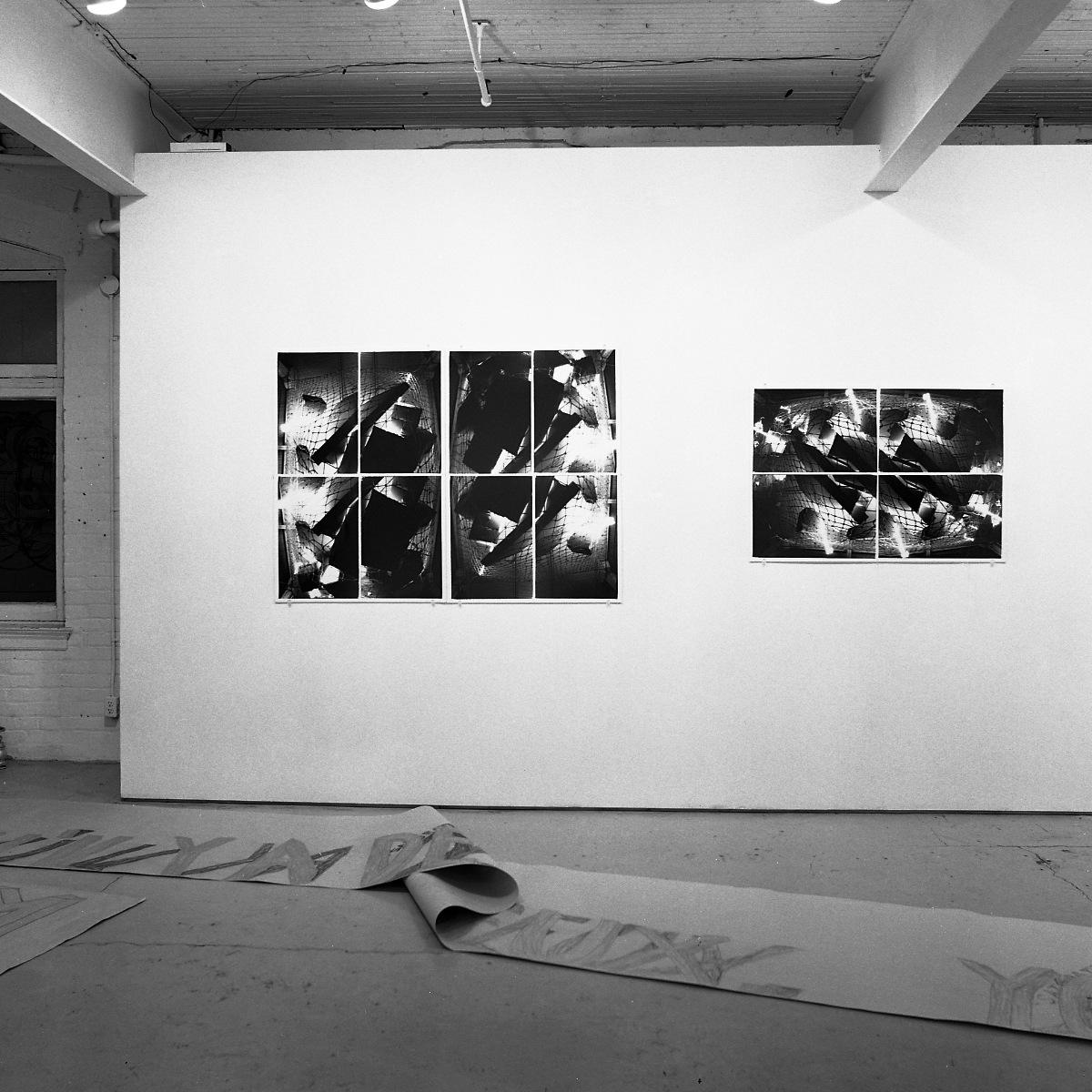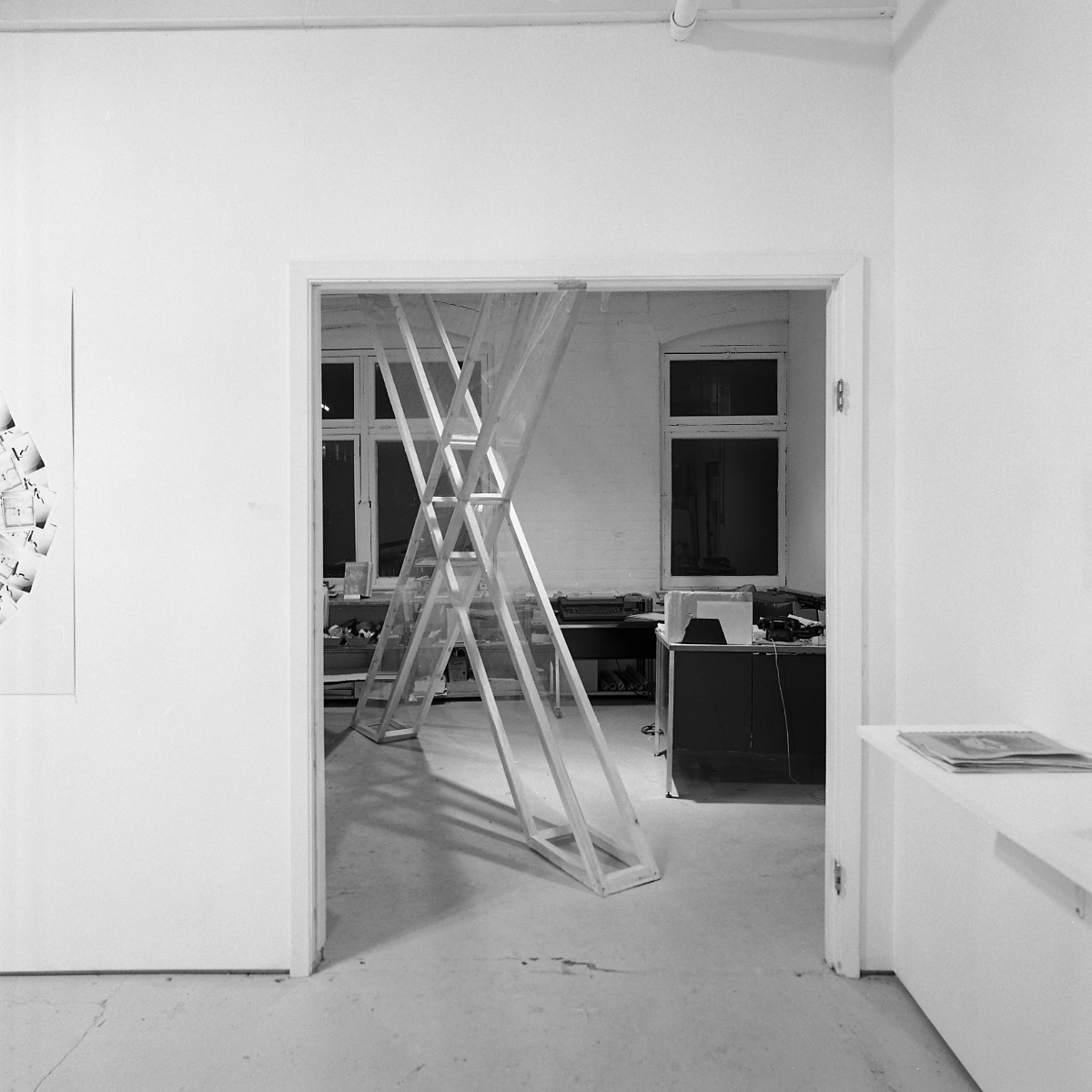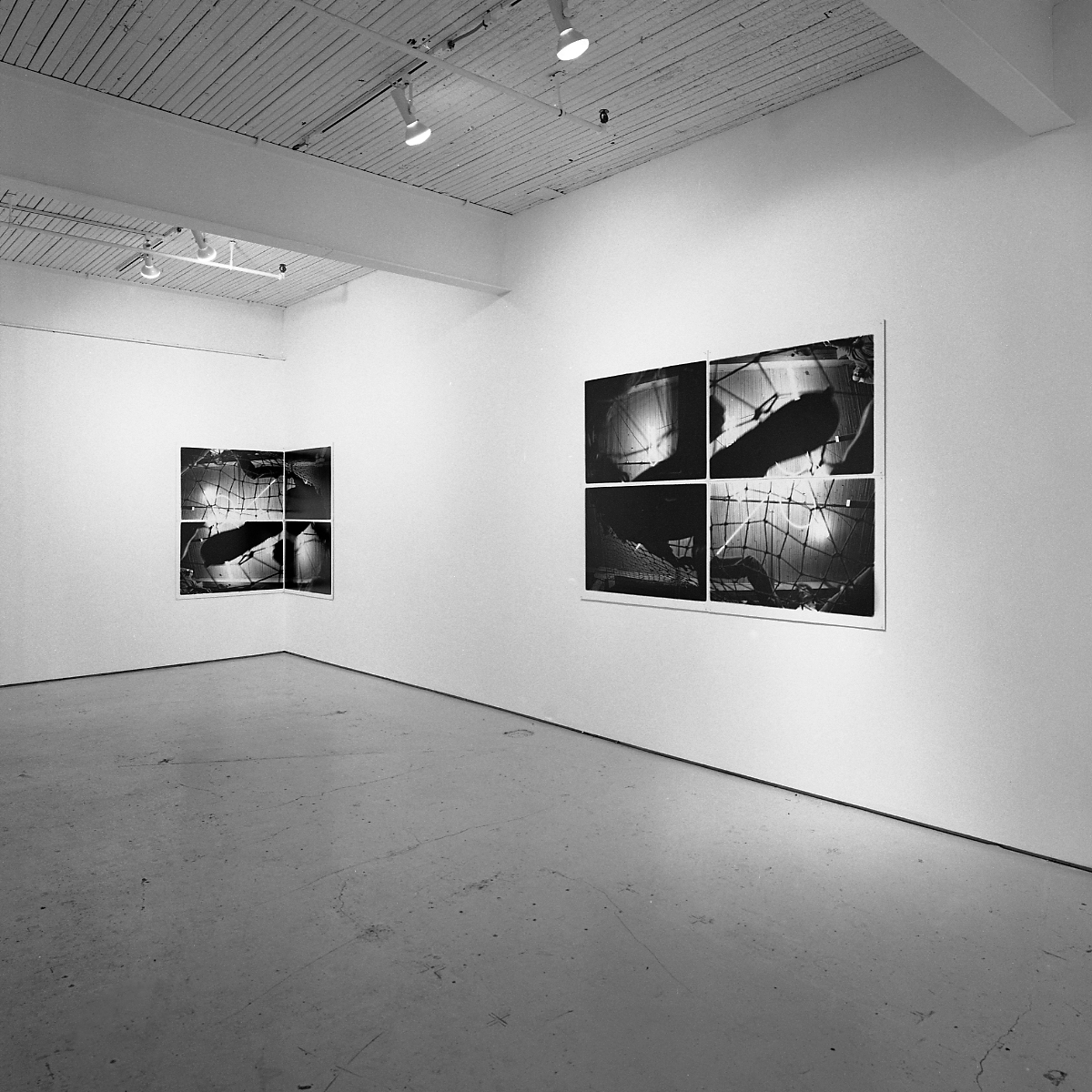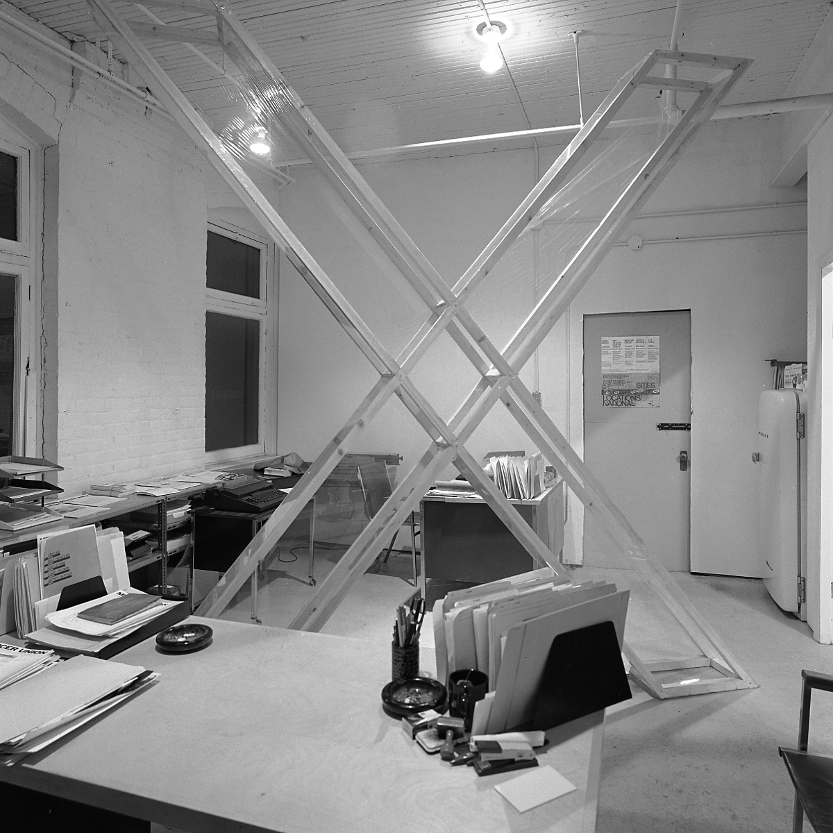 Haselden: I started thinking about the film idea in my studio, while I was drawing a lot and working with the net photographs, and the emptiness of my studio seemed to invite some kind of action down the space. In the film, through animation, we mote it, rotate it, give it different positions within the room, while at the same time the camera is locked onto a rotating tripod, so that the room itself is turning as well as the shape in it. The film is about reorienting or disorienting one's position in the room, using the "X" shape as an added ingredient to push that feeling harder.