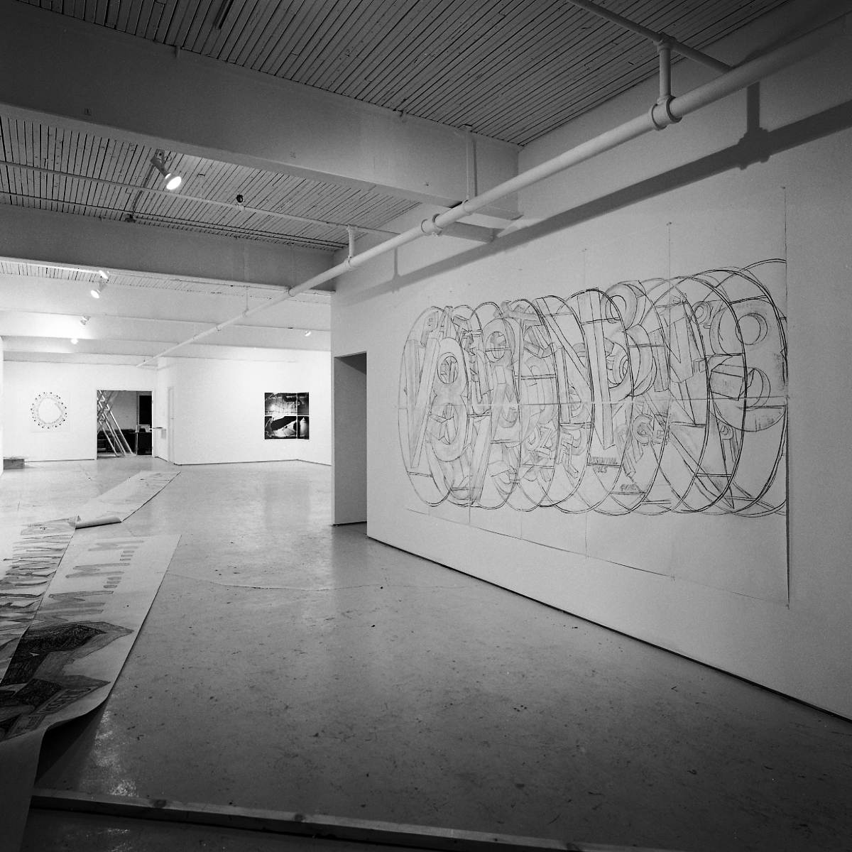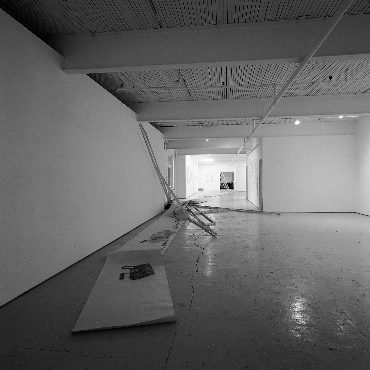 Haselden: When I came here I tried consciously not to drag my history over with me. In the earlier work the historical associations have more to do with evolution of time, whereas here the historical situation is more connected to politics. As for the surfaces, there's a few things to mention. I have a very definite sculptural interest and that I hope manifests itself in the way I've been using the space here. The long drawings on the floor have a sculptural aspect to me. They're not pinned up on the wall. They try and move through the space. They're the result of having a long studio.