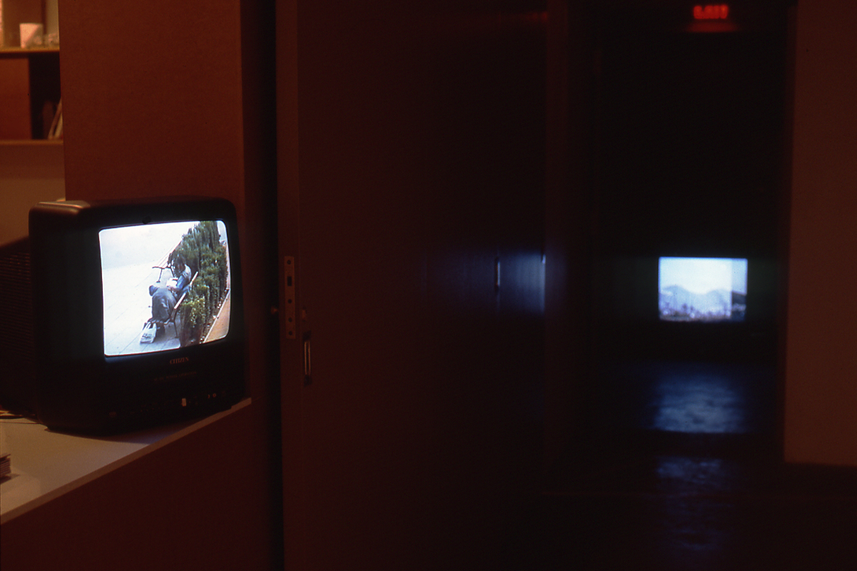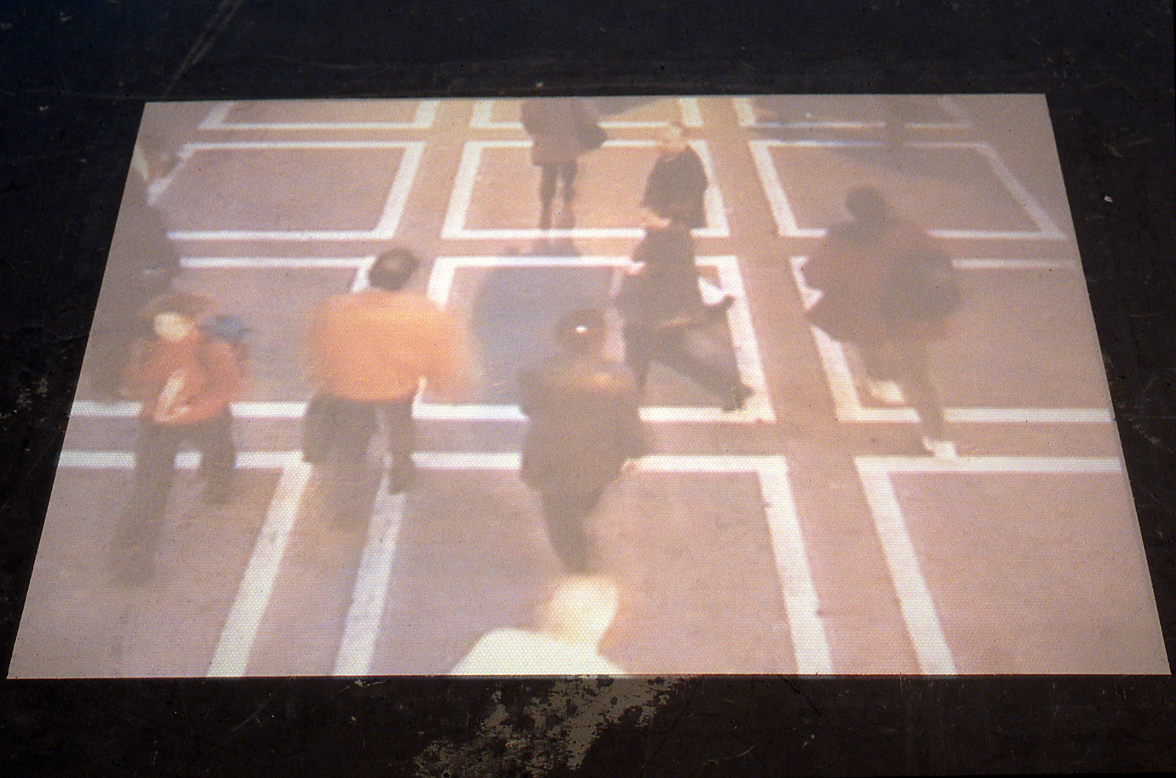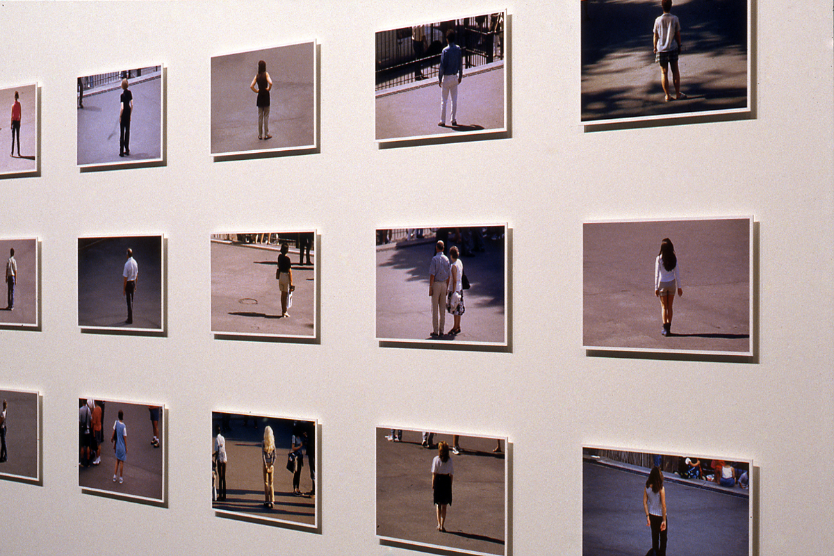 A languorous passage of time reveals another sort of transcendence in Germaine Koh's Side piece. Koh visually documents the occupation of two public benches by a group of four men while simultaneously recording the incidental audio of her own apartment where the camera is located. Watching Koh's clandestine images, we suffer an uneasy complicity. Two worlds unfold beside one another, separated by disturbing notions of privacy and economics. Yet, as days and nights pass, the worlds, almost imperceptibly, align. Eating, sleeping, reading, talking and sitting in silence, the bench and apartment dwellers fall into step. The mundane ascends to the monumental when a fighter jet streaks across the sky; the men crane their necks as Koh and her partner gasp in awe. The two worlds are companions, side pieces to one another. Time stands strangely still in Arthur Kleinjan's Paris Looks, a collection of images of tourists posing for their fellow travelers in front of Sacré-Coeur. Kleinjan captures his subjects from the position of their greatest vulnerability, above and behind, isolated from their camera-toting friends and they themselves are unaware of Kleinjan's activity. But as in Koh's video, quiet dignity levels invasiveness. Ultimately, the intimate act of posing for a friend or lover resists colonization. Kleinjan can record the image but he can not participate in the ritual of private confirmation the treasured snapshot affords.