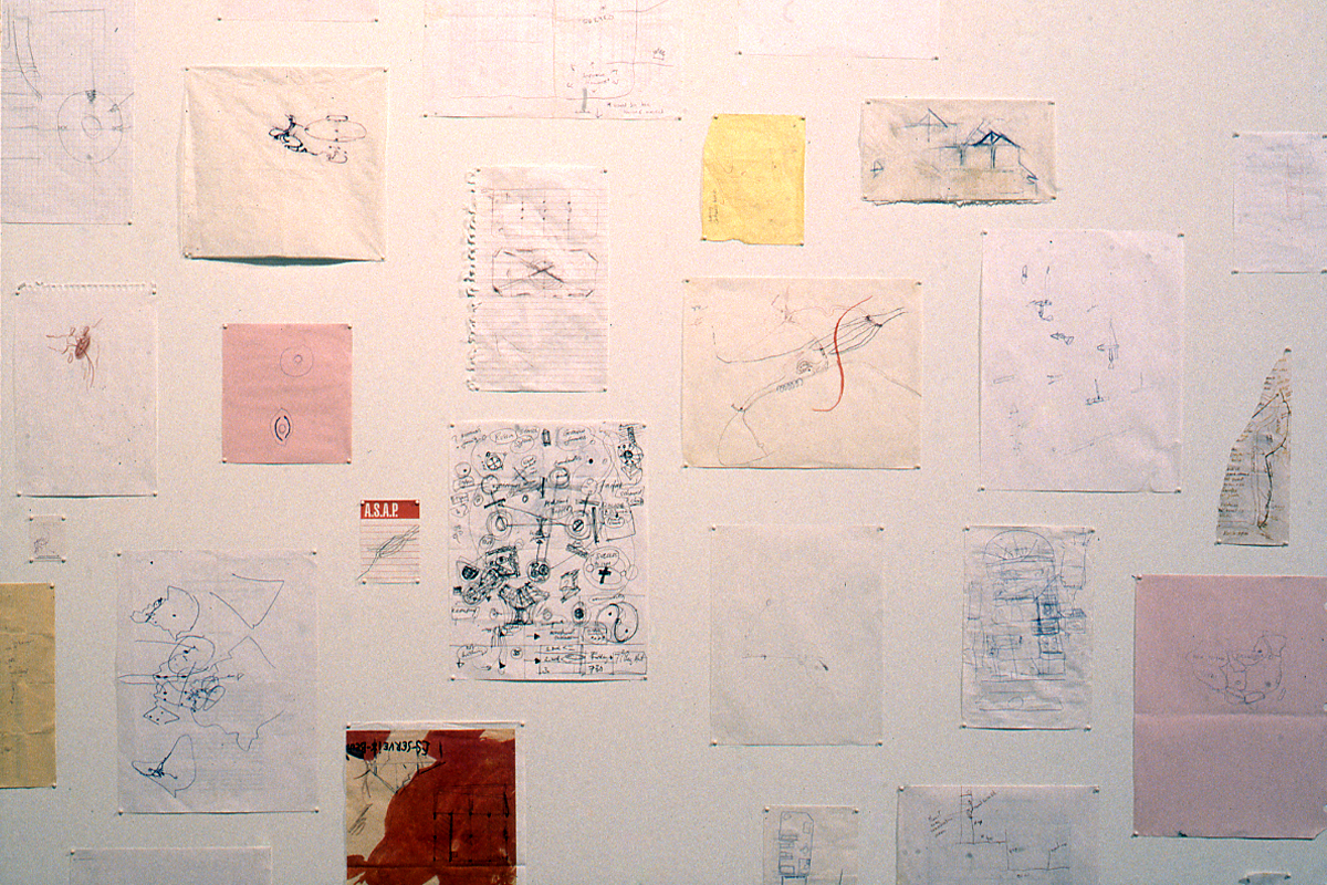 Katherine Harvey also must be content with artifacts untethered from their locus. Getting There From Here is a sprawling archive of hastily scrawled maps, urgent transactions accompanied at one time by mutual understanding, now floating abstractly through an unfamiliar space. These delicate found remnants trace a profound desire for a shared sense of orientation. I am compelled to decipher the anxious Yukon Tragedy. What tragedy? Whose death? In the morning, was it? The drawing keeps its secrets and I am left to construct my own fiction.