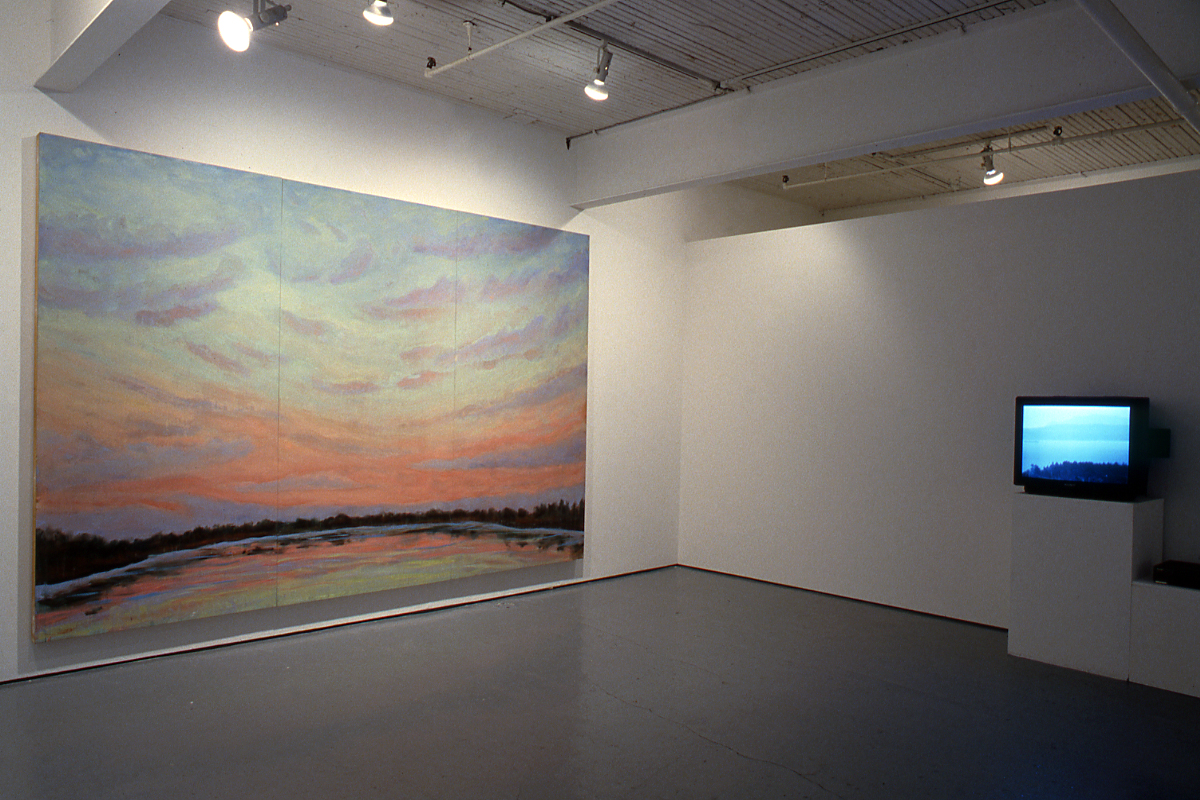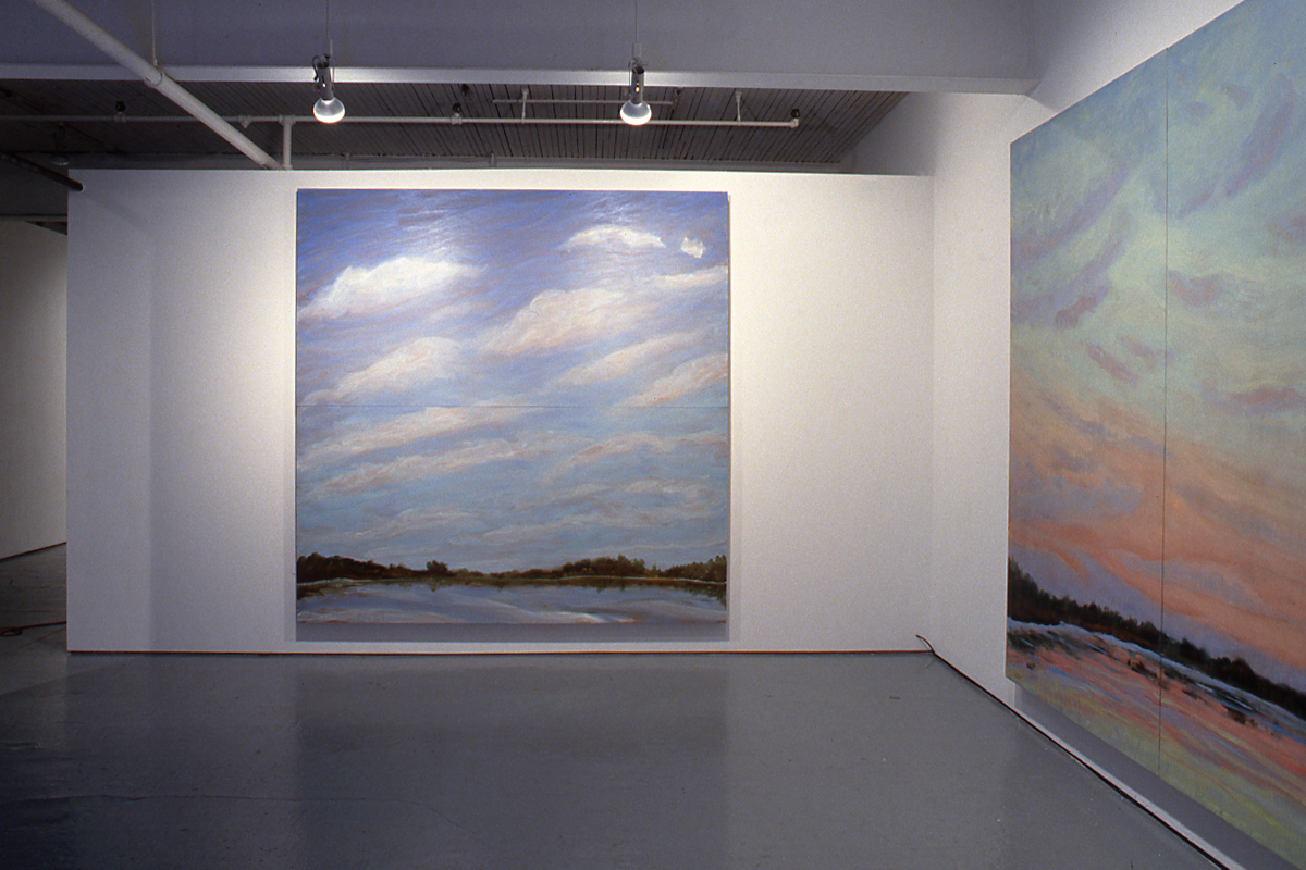 In 1988 Johnson abandoned the figurative, often sexually explicit, tableaux that formed the basis of her earlier work. Concurrent with a move away from Toronto, she began a series of plein air sketches that detail the effects of light and wind on the pond at her home in Flesherton, Ontario. The many sketches and the observations that they recorded were later reworked or remembered in the production of her large scale studio paintings. In both Green Sky and Hazy Sky, clouded expanses, continuous with the water in which they are mirrored, dominate the surface of the painting. Only a narrow strip of land, a band which cuts across the lower portion of the painting, separates the two. The airiness and intangibility of this image is emphasized by the physical structure of the paintings. On large wooden panels which resemble theater flats, loosely painted in layers so thin that the grain and colour of the wood appears through the brush strokes, Johnson emphatically recalls the high-keyed colours of Tom Thompson, but not his sumptuous surfaces. In this way she presents an image that communicates an ephemeral interior experience of nature rather than the sense of tangible materiality characteristic of the Group of Seven's objectifying depictions. The paintings' mnemonic reference to theatrical illusion, and huge scale which highlights the flat artificiality of its surface, underscore Johnson's deflation of dramatic effects associated with the production of the sublime.