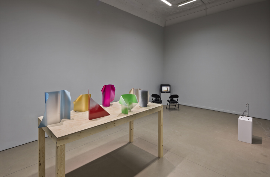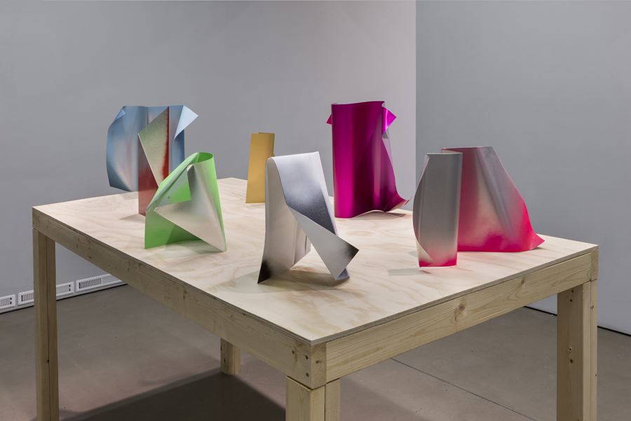 Michael Vickers' works sit between painting and sculpture, in prioritizing their object-hood physical struggle becomes manifest, highly industrialised materials are folded, pushed and beaten into other forms acknowledging the precarity of their formation and labour.