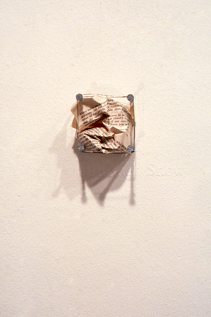 Houle and Poitras have appropriated from the dominant community images and citations which, when reconstructed or presented in new contexts, have the ability to critique a past method of thought. Houle, for example, has borrowed references from two distinct periods of modernist art history. Poitras has cited directly from a western text. In each instance, the artists have laid bare colonialist actions, in the first place as a consequence of obsolescence, and in the second as the result of government instituted genocide. In Houle's Kanata, the 'grandness' of oil painting--its colours, the colours of history--have not been included except for that of the 'Indian'. In Poitras' Small Matters, pages from Bury My Heart at Wounded Kneeare enclosed within wire 'fences' which have been nailed to the wall. The pages refer to four 19th century massacres of Native Americans; Wounded Knee, Summer Snow, Trail of Tears, and Sand Creek. A partial list of the lost tribes is stenciled below the wire enclosures.