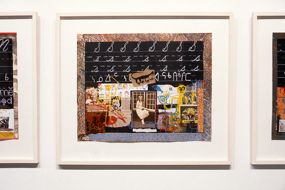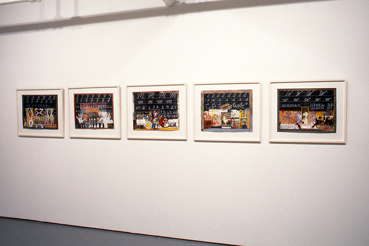 The work of Andrews, Leydon, and Ash Poitras critically alters the path of history as established thus far by infiltrating that history with new, disparate histories which neither legitimate nor follow that of the accepted norm. Each of these artists has chosen to present images which are not of the mainstream-- Andrews with 'faxed' portraits from a newspaper, Leydon with reproductions from 'minor' arts such as illustration and design, and Ash Poitras with an eclectic selection of images and texts drawn from both dominant and marginalized sectors. The transformation of these visual documents into works of art similarly denies the ideology of a progressive teleology inherent in modernist art history.3 Andrews' portraits of men who have died of AIDS or AIDS related causes, appear at a distance to be 'shot' out of a fax machine, they are however, the result of a process of scratching into tablets layered with beeswax and graphite requiring hours of labour to complete. The method is a labour of love--of intense, time-consuming work, associated with embroidery and quilting--again suggesting a non fine art affiliation. Leydon's collages, while combining a variety of non-high art images, are moreover 'framed' with tape as if they were laboratory specimens prepared for scrutiny under a microscope. Ash Poitras' collages similarly reject a western conception of the Work of Art. Situating her images on an implied blackboard, Ash Poitras uses the primary teaching implement of the white educational system whose history denied and maligned her concept of herself as a Native Canadian, in order to teach us the lessons she has subsequently learned--of pride and place and identity. Andrews, Leydon, and Ash Poitras by denying the constraints of the mainstream, and by either directly criticizing or overtly contesting (via statements of difference) the status quo, have managed to validate their particular positions of resistance as eminently powerful and ever present.