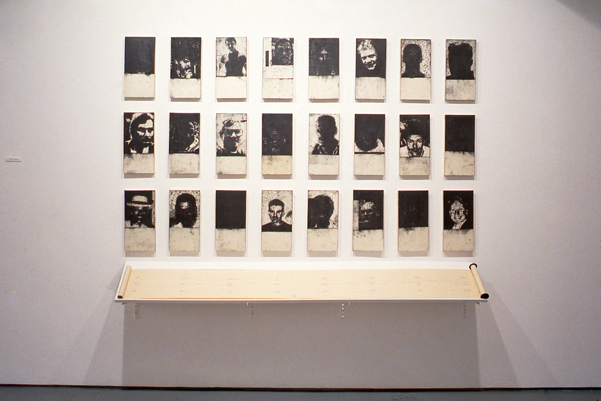 A common thread throughout the work of all of the artists in Rethinking History is the creation of a narrative which is not linear but fractured, diachronic, expressive of substantive moments of cultural/communal specificity. In keeping with this manner of visual history-making the artists have created works which reflect this fragmented nature. On the one hand, each work is composed of several separate pieces; Abrams has created a series of eighteen paintings, three of which are included in the exhibition. From Andrews' series of ninety-five individual portraits, twenty-four are included. Houle's painting is comprised of four panels, Leydon's Eidilon consists of twenty collages, and so on. On the other hand, the number of images gathered within each work are also able to function independently. Employing objects, portraits, artistic style, mnemonics, memorials, and the alphabet each artist creates works which can act individually or as a series in order to present their message. This fragmentary character is suggestive of continuity. As a variety of technical devices were employed by early modernist painters to intimate extension beyond the space defined by the picture plane, and by later artists to reveal and acknowledge the two-dimensional surface of illusion, the artists in this exhibition have utilized devices which indicate a contemporary view of time and space and the work of art. Consistent with Derrida's notion of the trace--of everything being not just present or absent but past, present, and future at once --these works, in their openness to addition or deletion, intimate an origin, a current moment and a future.
