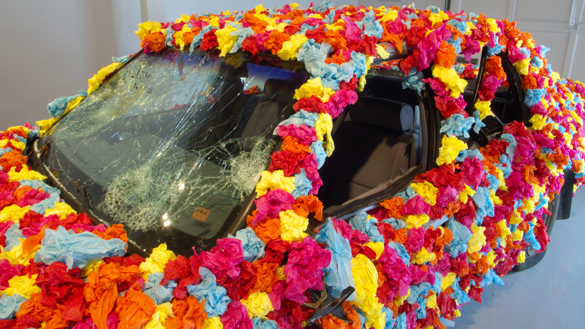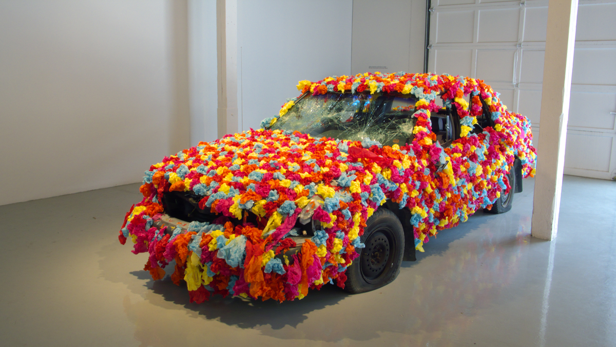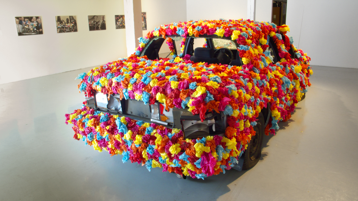 Anitra Hamilton’s Beater, is a defunct automobile covered in colourful tissue-paper pom-poms and converted into a festive piñata – complete with nacho chips, salsa and tequila- which blindfolded participants are invited to smash with sledgehammers.*