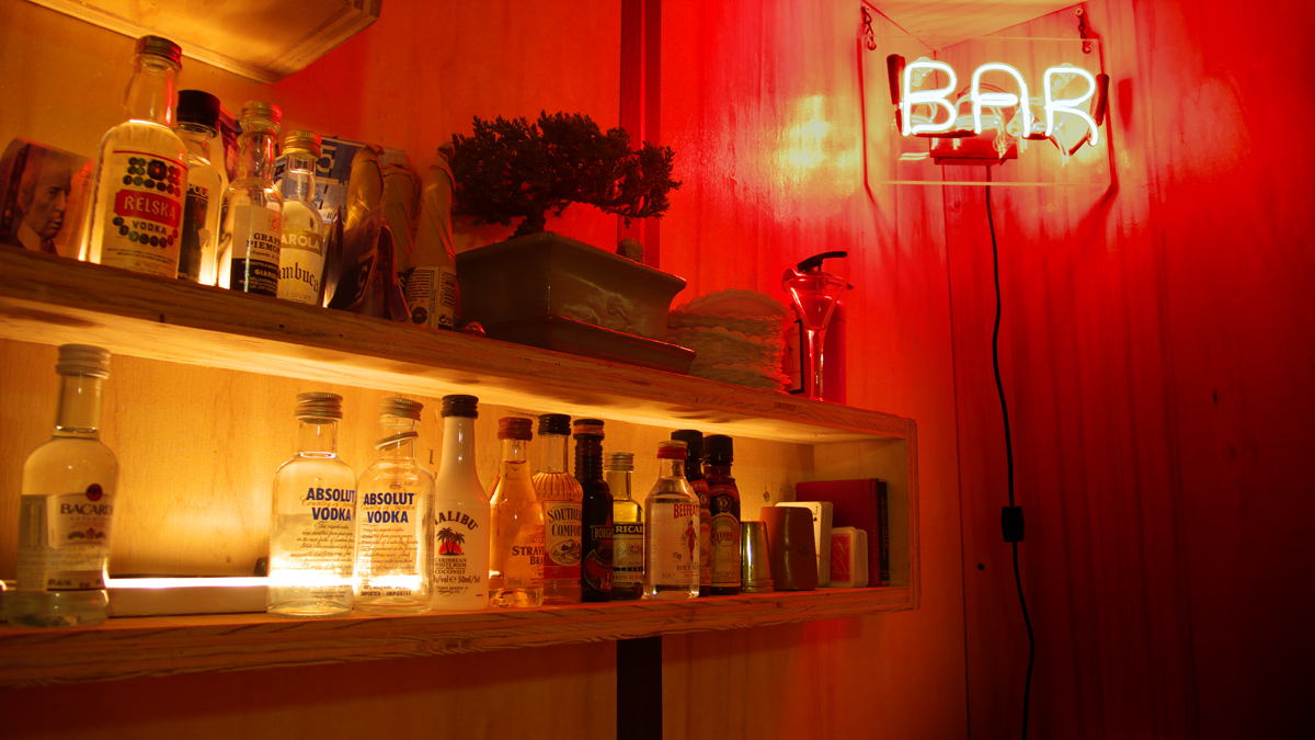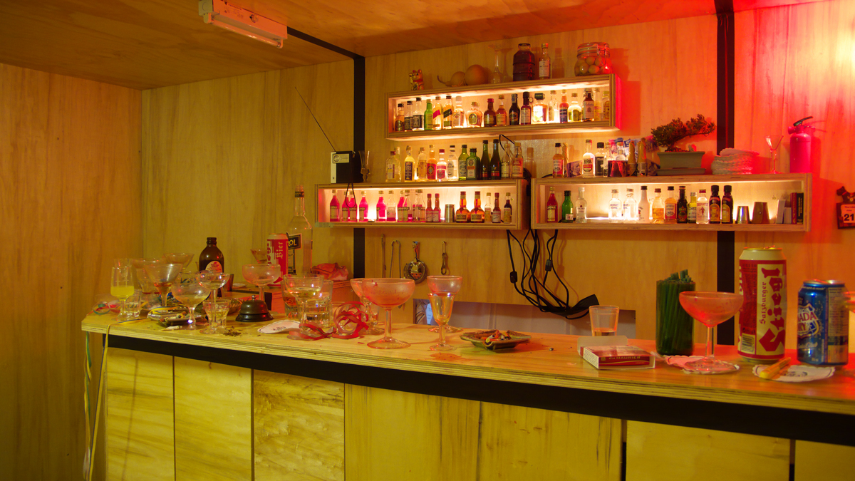 Dean Baldwin has constructed a fully stocked mini-bar in the back gallery, from which he will serve tiny cocktails, in a welcoming but somewhat claustrophobic Alice in Wonderland environment.