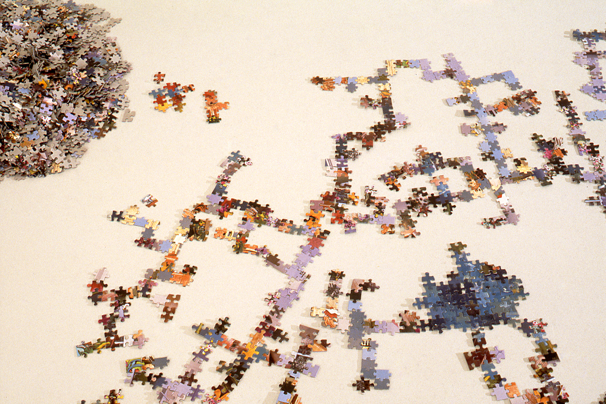 R.M. Vaughan doesn't believe in self-help. The therapeutic industry creates endless tests and questionnaires merely to convince you that you need fixing. Vaughan wants us to help him. In Play It As It Lays, a platform of puzzle pieces entice us with pretty colours and lots of fun. We're invited to go nuts, put the pieces together with him in anyway that we want. The strict order is no one's concern. It's an organic process, just like life. It's fun sitting on the platform with Vaughan - chatting and playing, keeping busy. Here, relationships are forged, trust built. In Pumpkin, Vaughan has created a fiction in which the characters routinely arrive to gather, chat and keep busy, as well. The women are caregivers, mothers passing the time of day while the children play. It's Thursday again, everything seems in order, everything seems safe. For comfort and support, one need only call out.