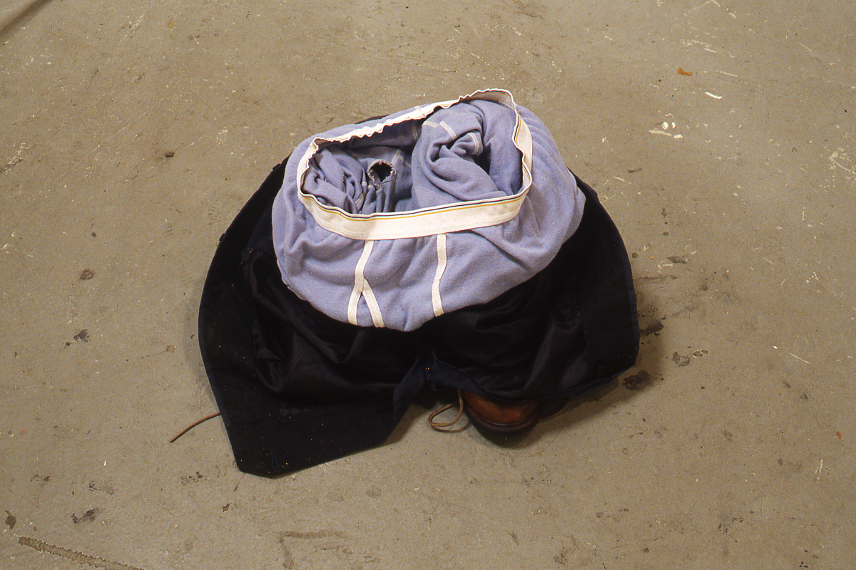 Susie Major offers us a diversion of a different kind. In Rest, piles of dishevelled clothes are clumped unceremoniously on the floor, if only temporarily. Her clothes, dropped from the waist down, are left behind like the worries and responsibilities we all wish would happen some time other than now. We see whatever she's wearing that day, whatever she's brought with her. Like going to bed at night, the clothes drop and the drift into dreaming begins.