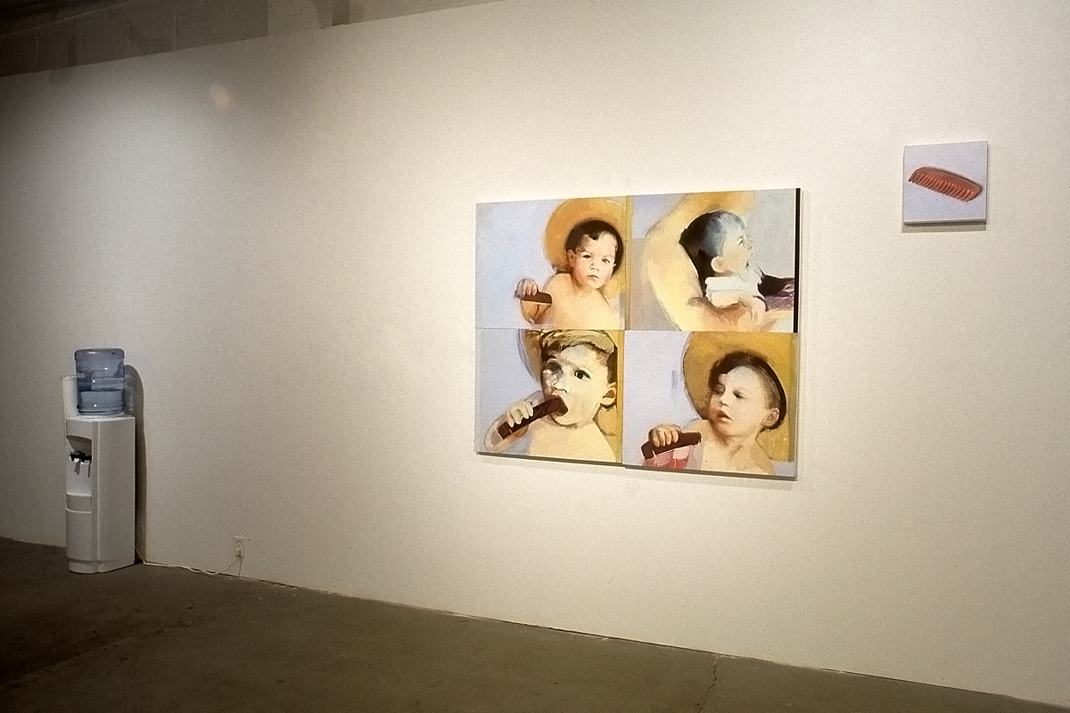 Joan Dymianiw is letting go. All she really wants is a suitcase filled with things that matter to her. One such thing is a video tape of a collection of home movie clips from childhood - hers and those close to her. It contains a sequence that she was unfamiliar with, that of her then one-year-old brother playing gleefully with a new discovery, a comb. Appearances 1959 is a fractured narrative of that moment. Deftly painted on four panels, the sequence is a blur of boundless energy, echoing both a child's development and an adult's fleeting memory of the past. The boy holds the comb, stares at it, puts it in his mouth. The comb is his. Suddenly, as the comb is taken away, the boy howls. A simply rendered red comb stands apart and, like most of our desires, just out of reach.