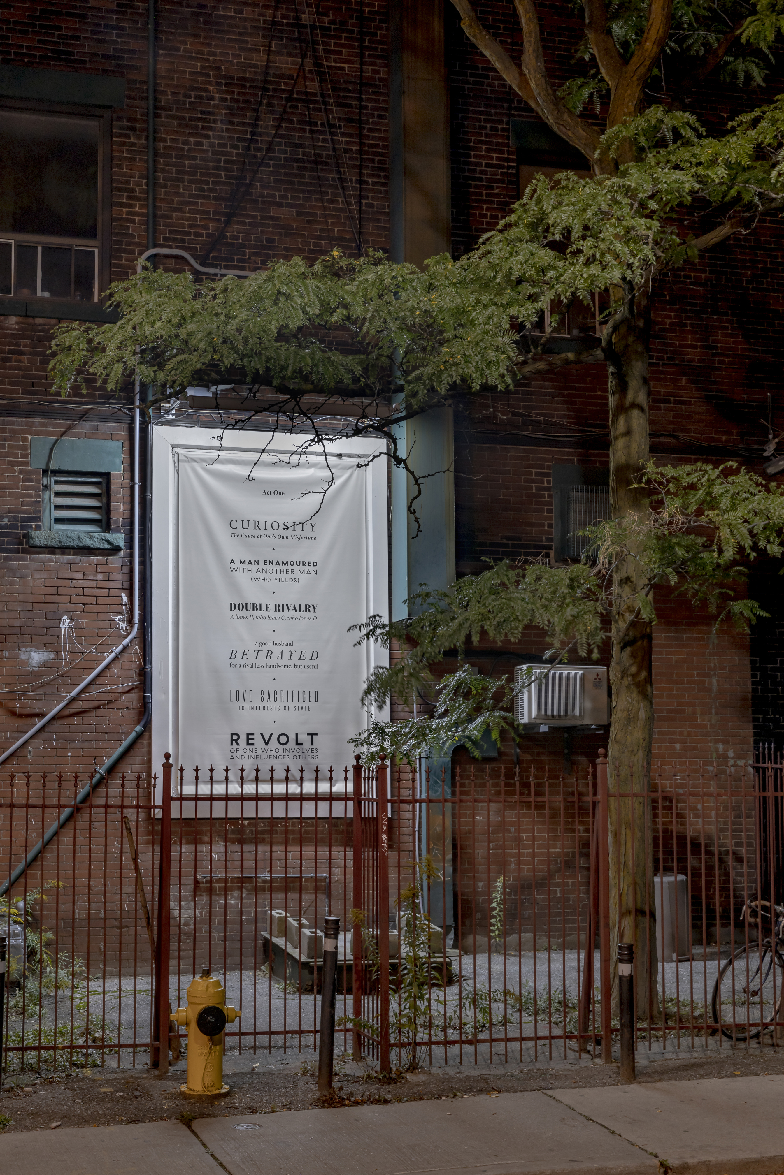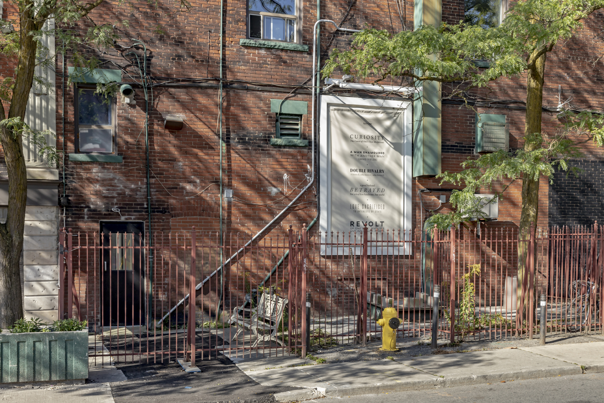 Taşdelen’s new work for the billboard is an extension of the artist’s current research and explores ideas of performance without the presence of live bodies. Entitled Vicissitudes, the project will emerge from adaptations of textual material from the 19th Century text The Thirty-Six Dramatic Situations, which comprises a seemingly exhaustive list created by French writer Georges Polti to describe and categorize all possible dramatic situations that may structure a story or performance. Out of the 322 sub-categories introduced by Polti in this volume, Taşdelen selects and typesets six situations for each billboard, arranging them in list form as if to suggest the sequence of events in an act. Taşdelen’s situational descriptors suggest ways of looking, offering to the reader a pair of lorgnettes through which the surrounding neighbourhood can become animated, and the goings-on of its people playfully subtitled.