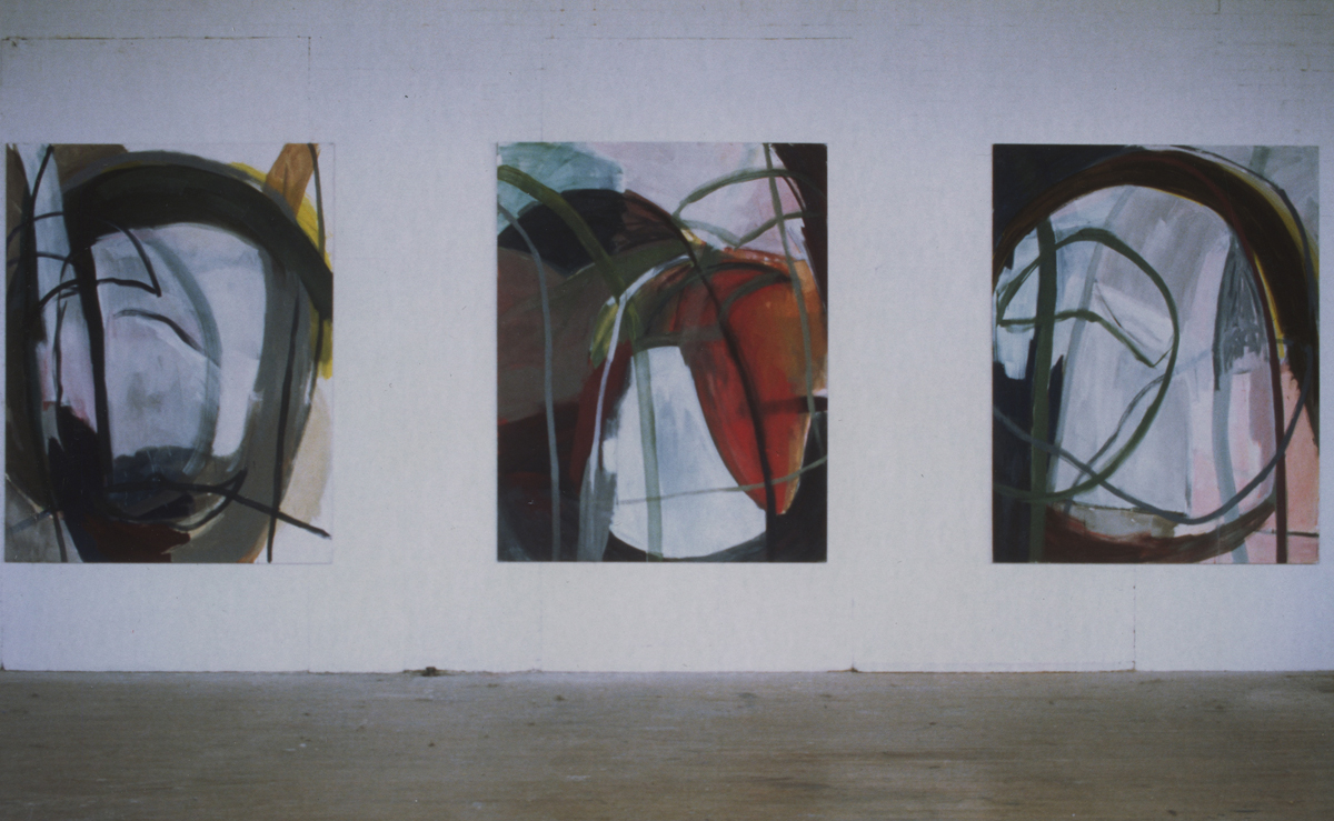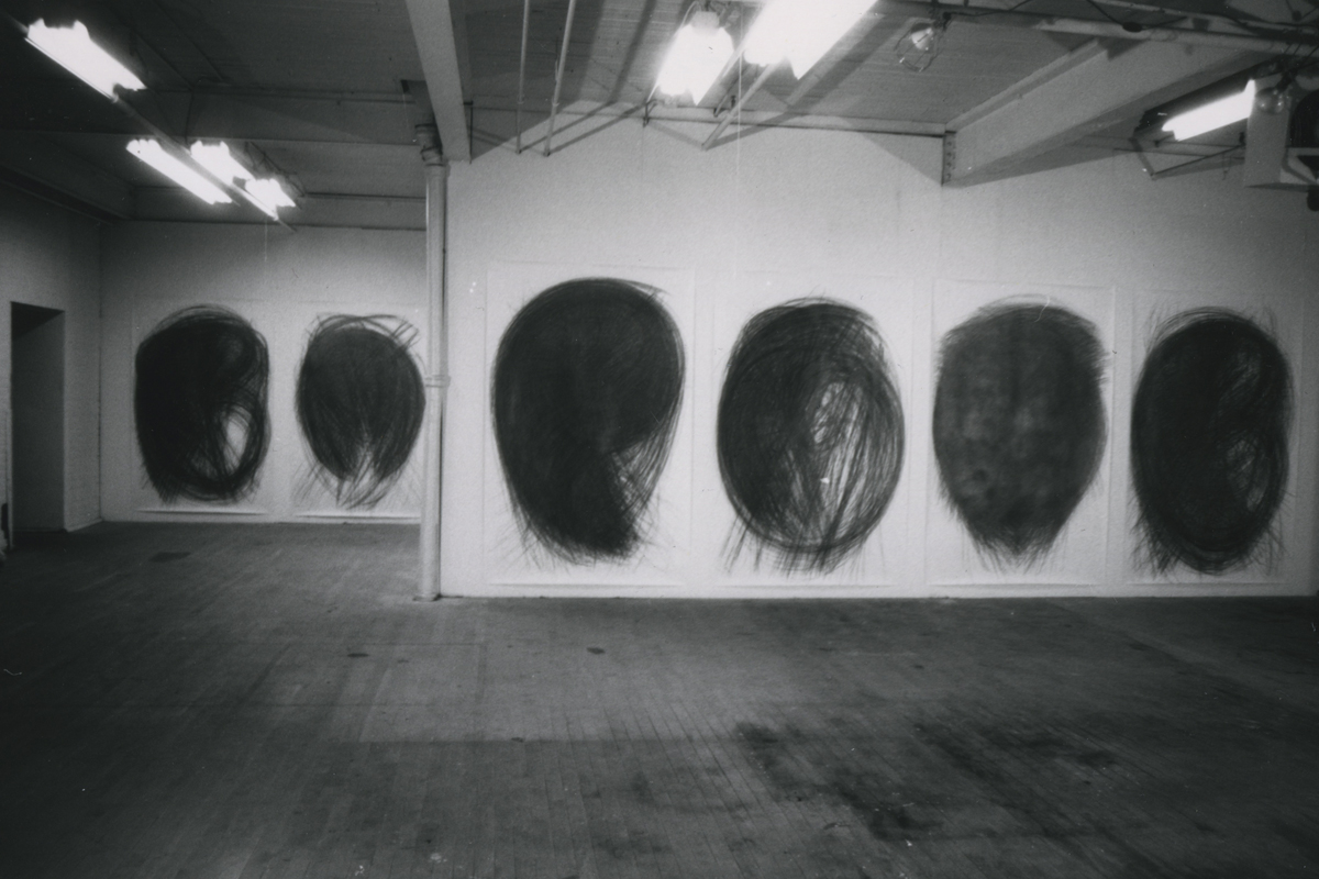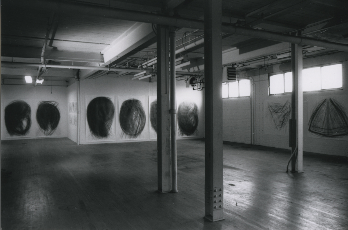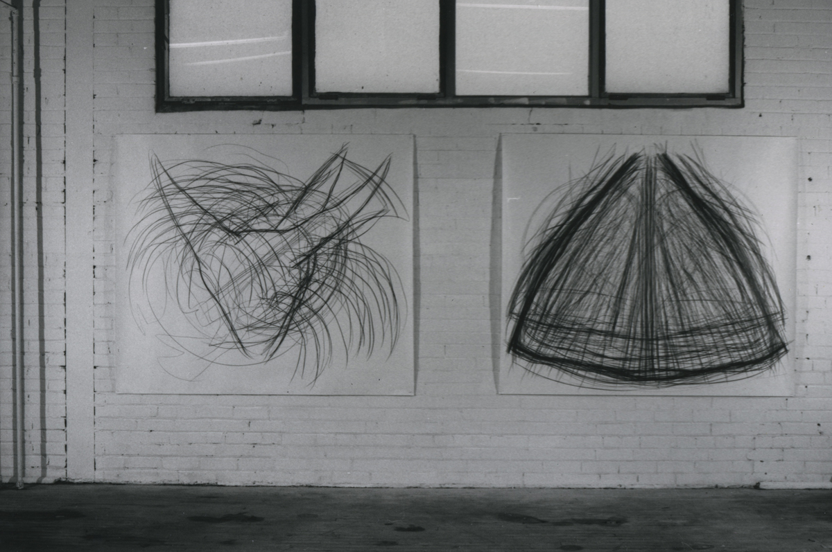 While their attitudes are similar the artwork is very different. Hellinger's large tempera and oil paintings deal with the exploration of space and the "spatial structure of an image." The finished, untitled paintings are in constant motion, as the shapes and colours appear and disappear across the surface. Titze's strong graphic drawings on paper consist of hundreds of lines that extend as far as the radius of her arms and body will allow. Over and over, a certain gesture or rhythm is repeated, resulting in exceptional drawings that are organic and figurative in essence. "Even though I am always working with symmetry and the body in an abstract way," she says, "I always return to the basic forms such as the spiral, circle and triangle."