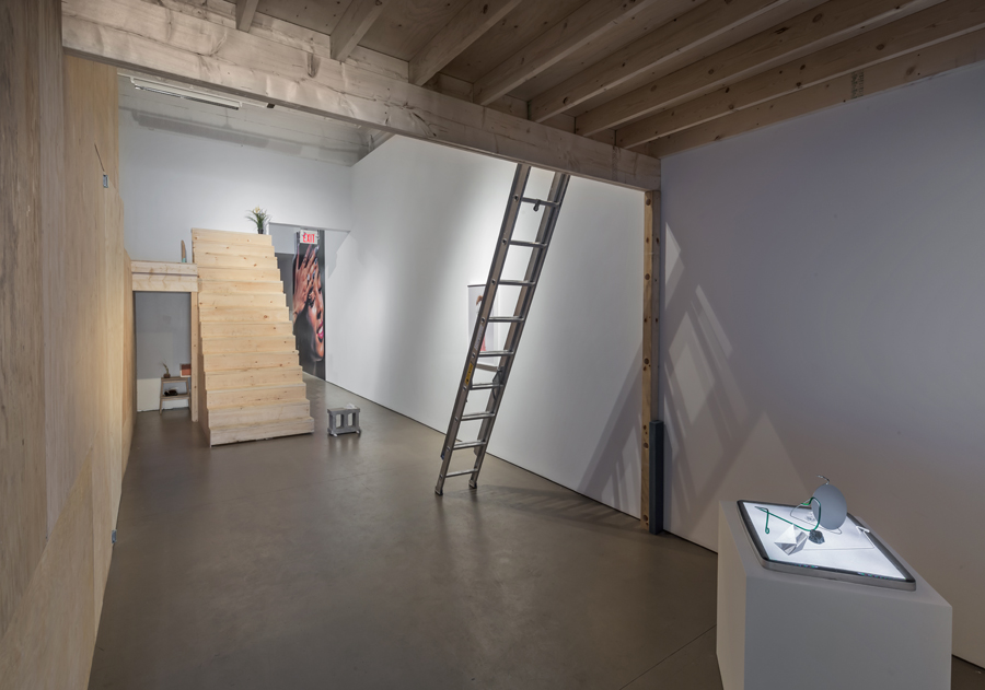 Not together, but alongside explores the potentiality of relationships between the viewer and the artist, the collective and the individual, the gallery and the studio. In their large scale installation sprawling through the front gallery of Mercer Union, platforms become seats, objects perform and the potentiality of action plays out. Their material exploration and unfixed nature in the work conflates the formal and the comedic. The disparate elements that comprise the installation further emphasize its makers as a group of individuals with different ideas and art practices working together. That spirit and the process of discovering alternate viewpoints extends to the gallery visitor, because the experience is a negotiation of both physical bodies in space and what it means to assess or determine: to do or undo, the separation between the studio or gallery, and experiment or art object.